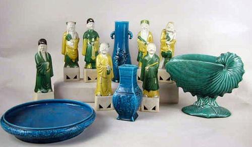 SEVEN YELLOW AND GREEN ASIAN STATUES; 10"h, AND four addition vessels
