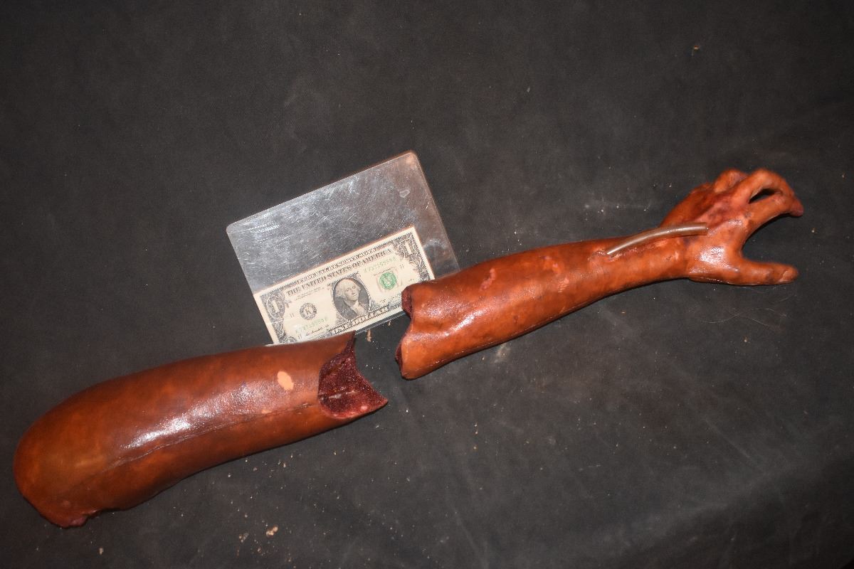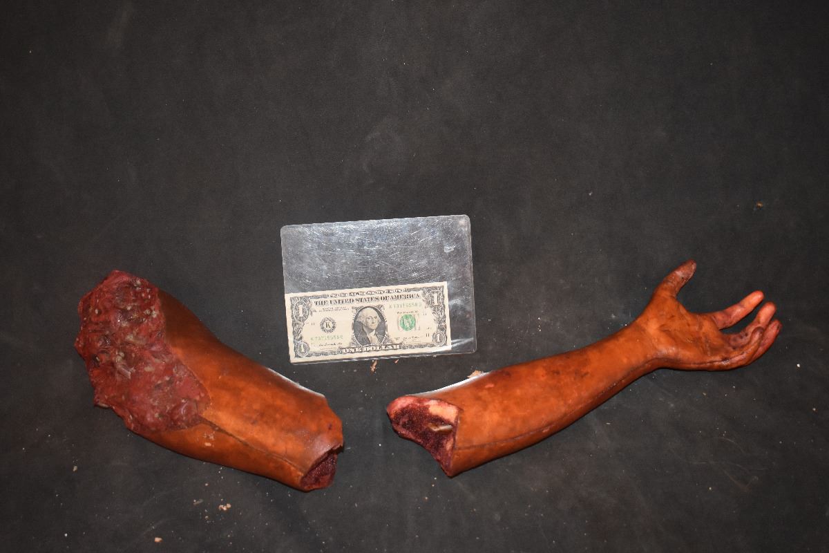 SEVERED ARM WITH BOTH PARTS AND BLOOD RIGS INTACT.