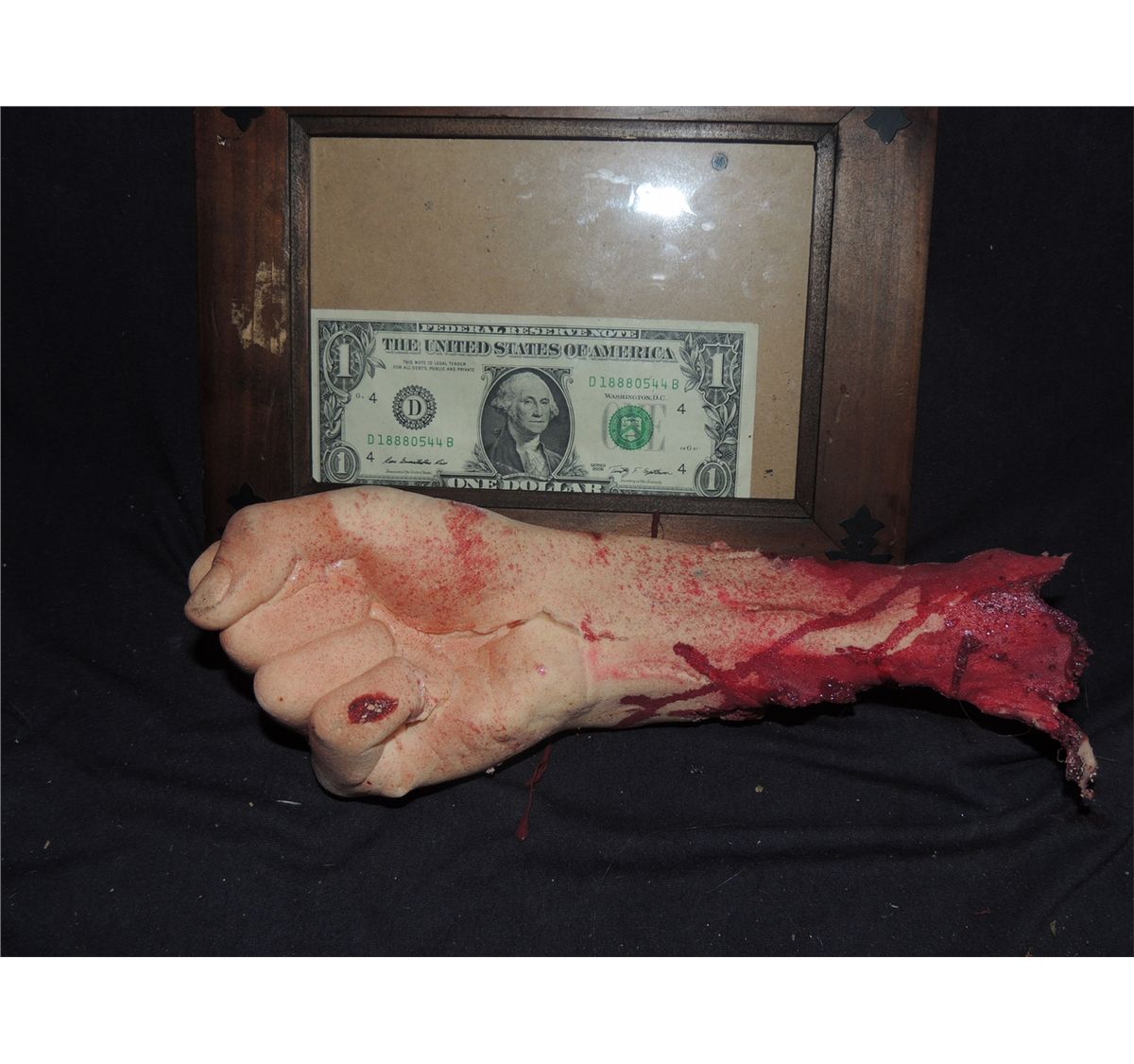 This is 1 of several severed bloody arm with hand props offered. Most are finished with excellent gore at stump. These are all unique, and made of different materials from durable urethane, to foam filled latex, to poly foam, and will last for years of use, even stand up to rental!