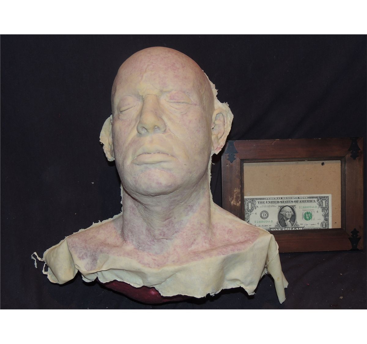 This is 1 of several severed bloody heads. Most are finished with excellent gore at stump. These are all unique, and made of different materials, from durable urethane, to foam filled latex, to poly foam, and will last for years of use, even stand up to rental!