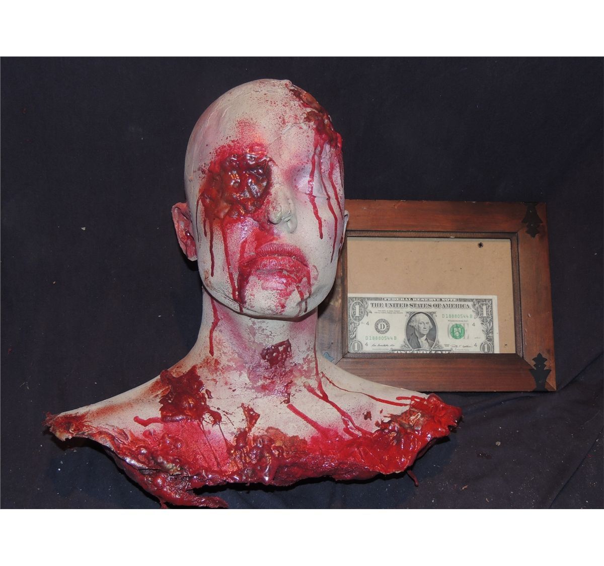 This is 1 of several severed bloody heads. Most are finished with excellent gore at stump. These are all unique, and made of different materials, from durable urethane, to foam filled latex, to poly foam, and will last for years of use, even stand up to rental!
