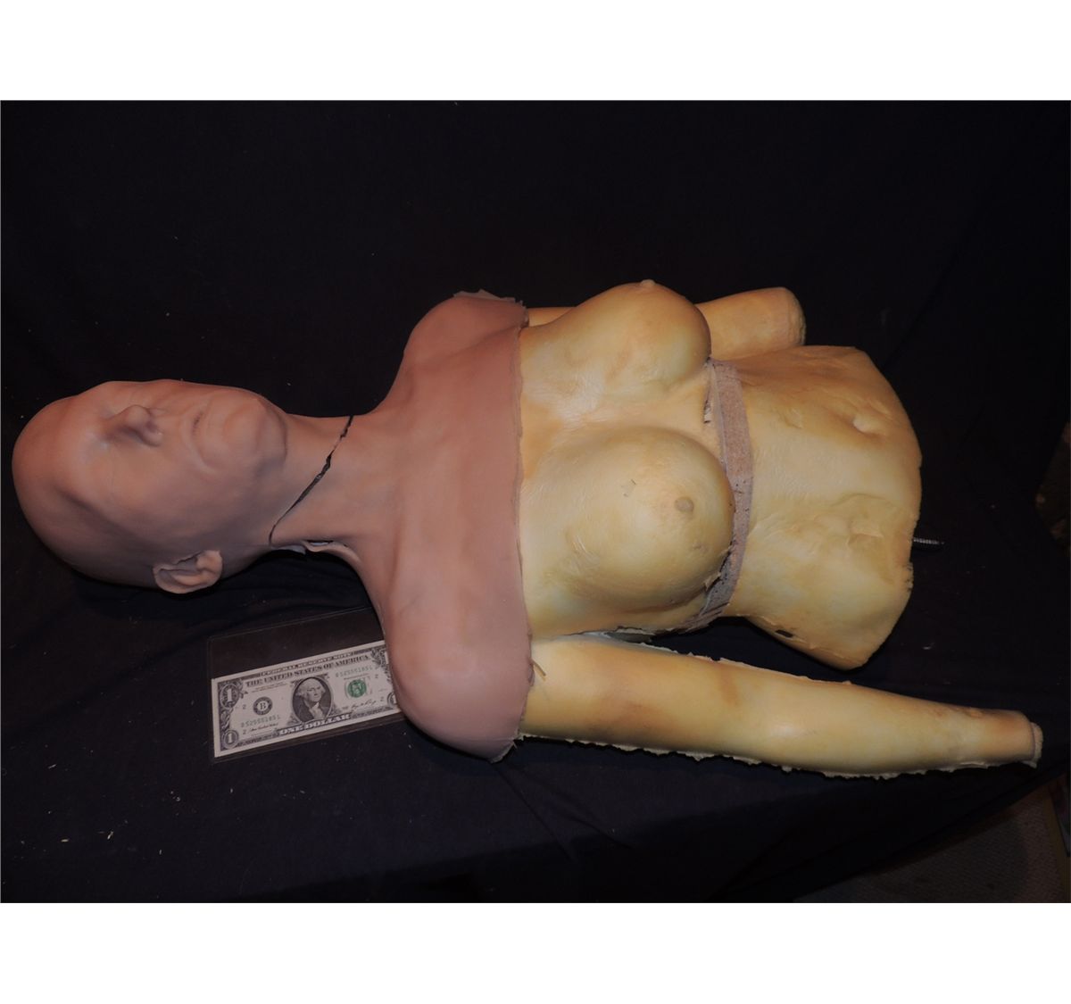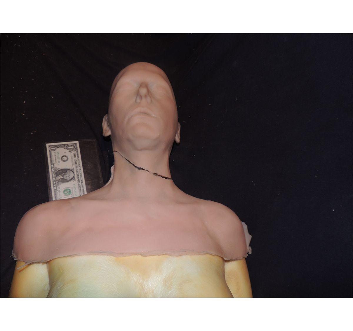 This is a severed head rig with the upper torso. Head has fiberglass under skull with a chain to prevent it from coming off completely. Screen Used, but this was shot practical, then CGI over.