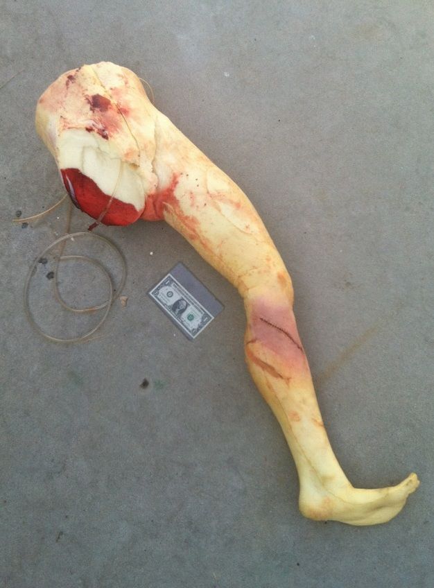 This is a severed lower torso bloody ass rig with one leg which has a silicone wound appliance on the chin. Perfect for use in your Haunt or Indy Film.