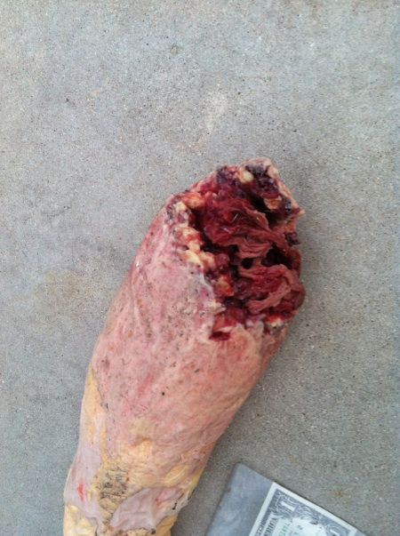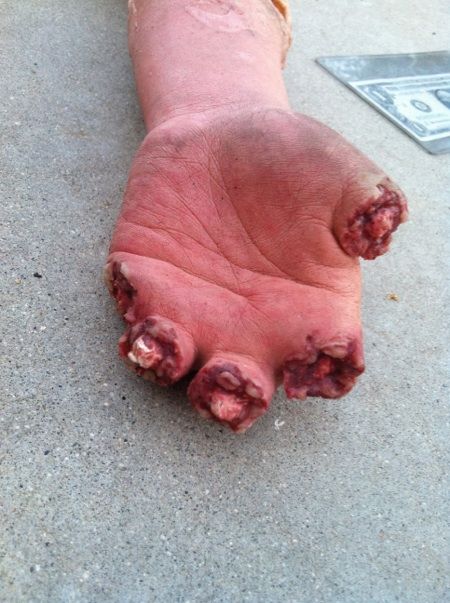 This is an incredibly cool severed human arm made of poly foam with silicone shoulder gore and forearm with chewed of fingers. Must have for your Haunt.