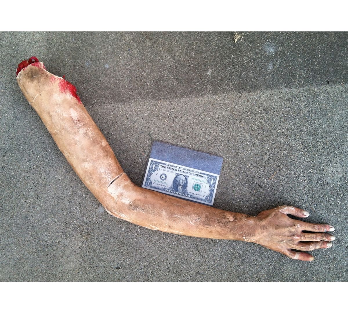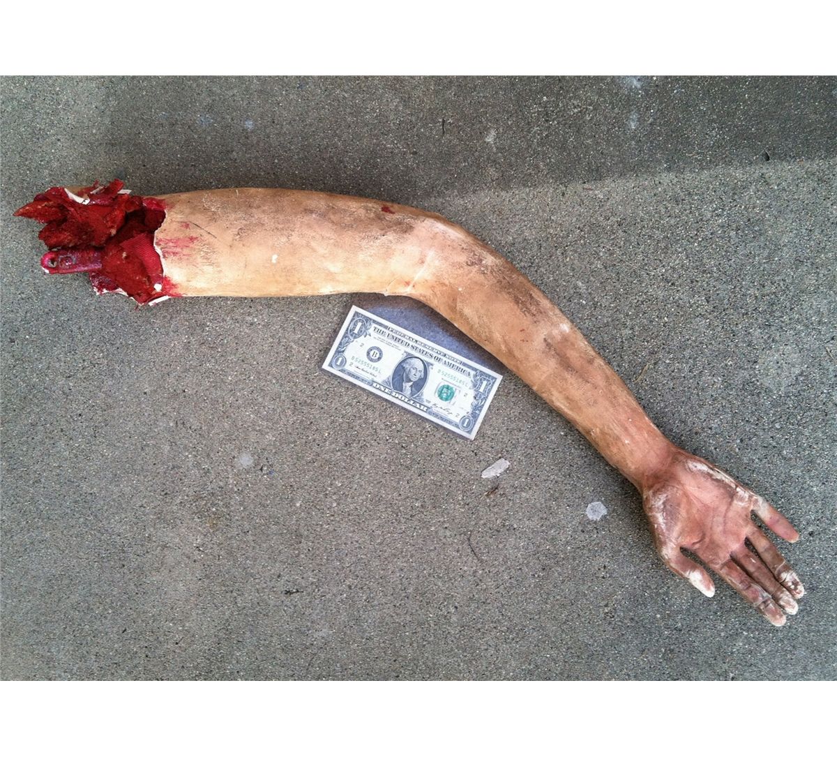 Offered here is a very cool severed armatured silicone right arm with some blood at the shoulder. Heavy raw silicone over an acrylic foam. There is a split around the elbow, but all the fingers are all intact. Excellent for use in your Haunt or Indy Film.