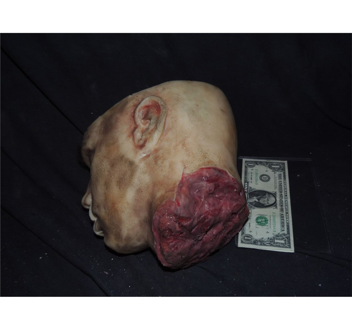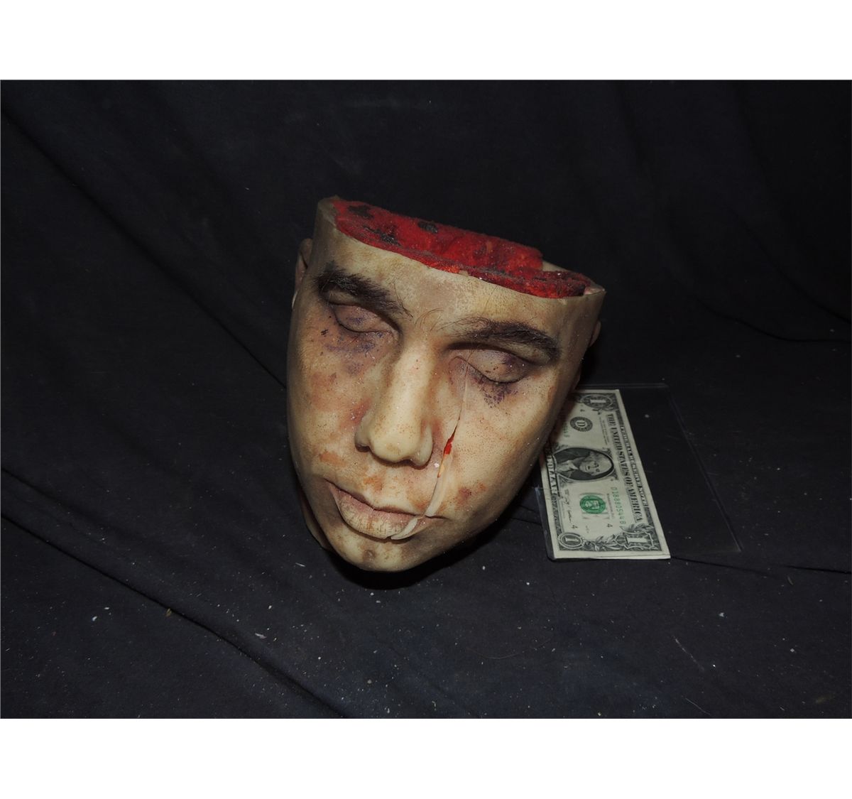 This is a well made severed silicone head with gore at stump and skull cap cut off.