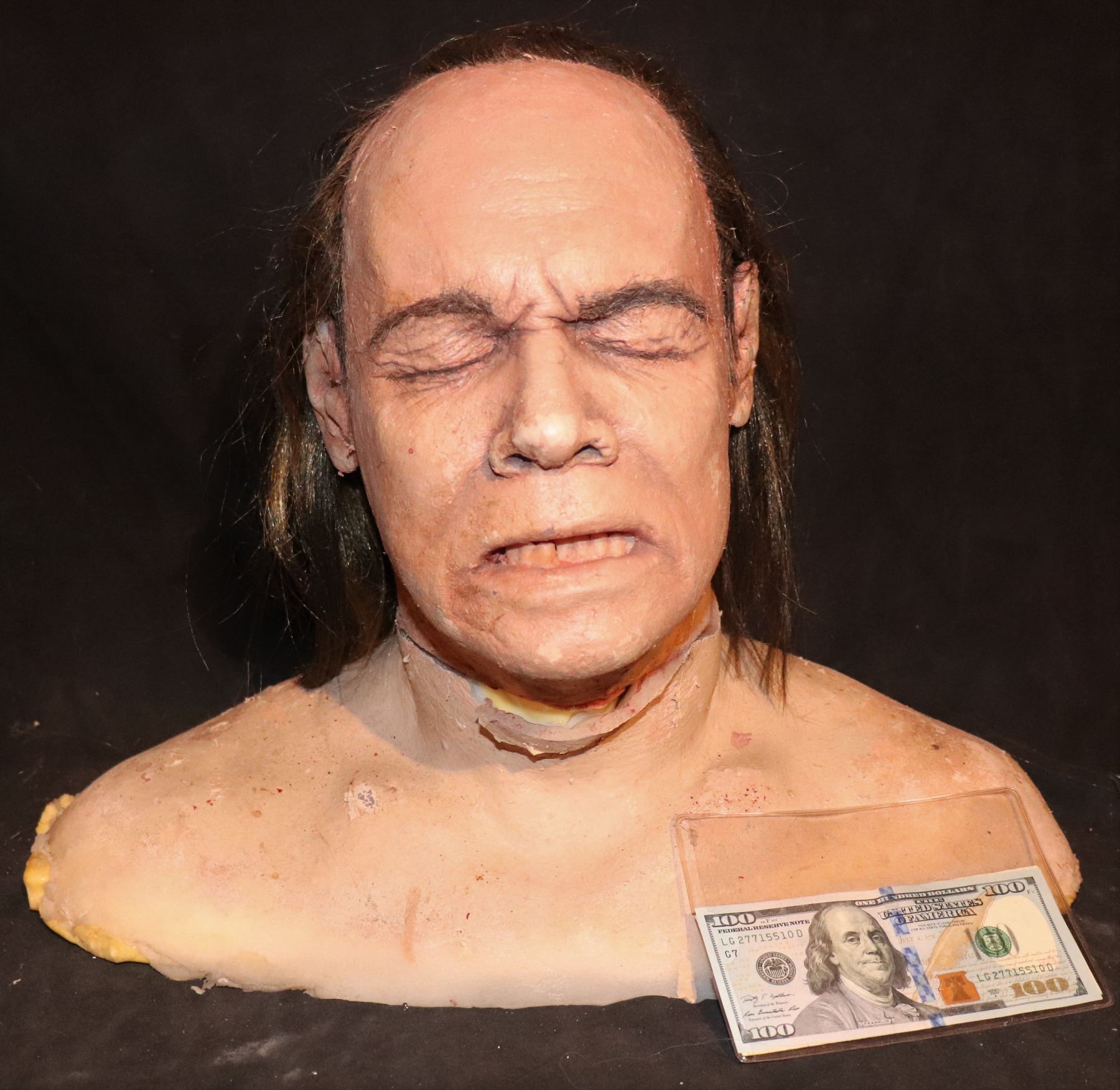 It is very rare that a Severed Silicone Head of this quality comes around. With the Matching Stump? A-Plus Quality and Condition! Perfect ears and nose. Hand Punched Hairs!