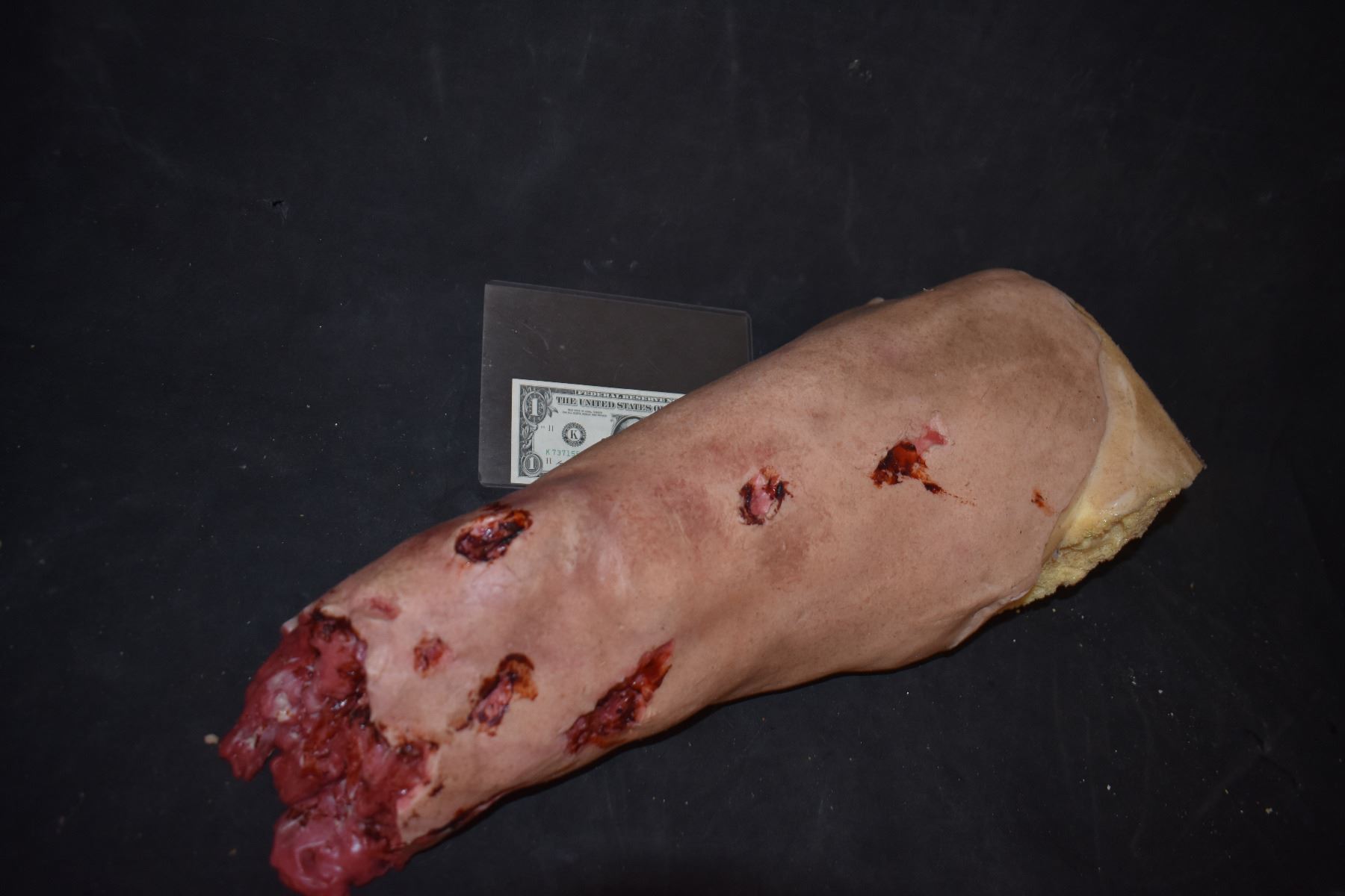 These are all silicone on polyfoam severed and mutilated leg pieces. All show gore and bones at both ends.