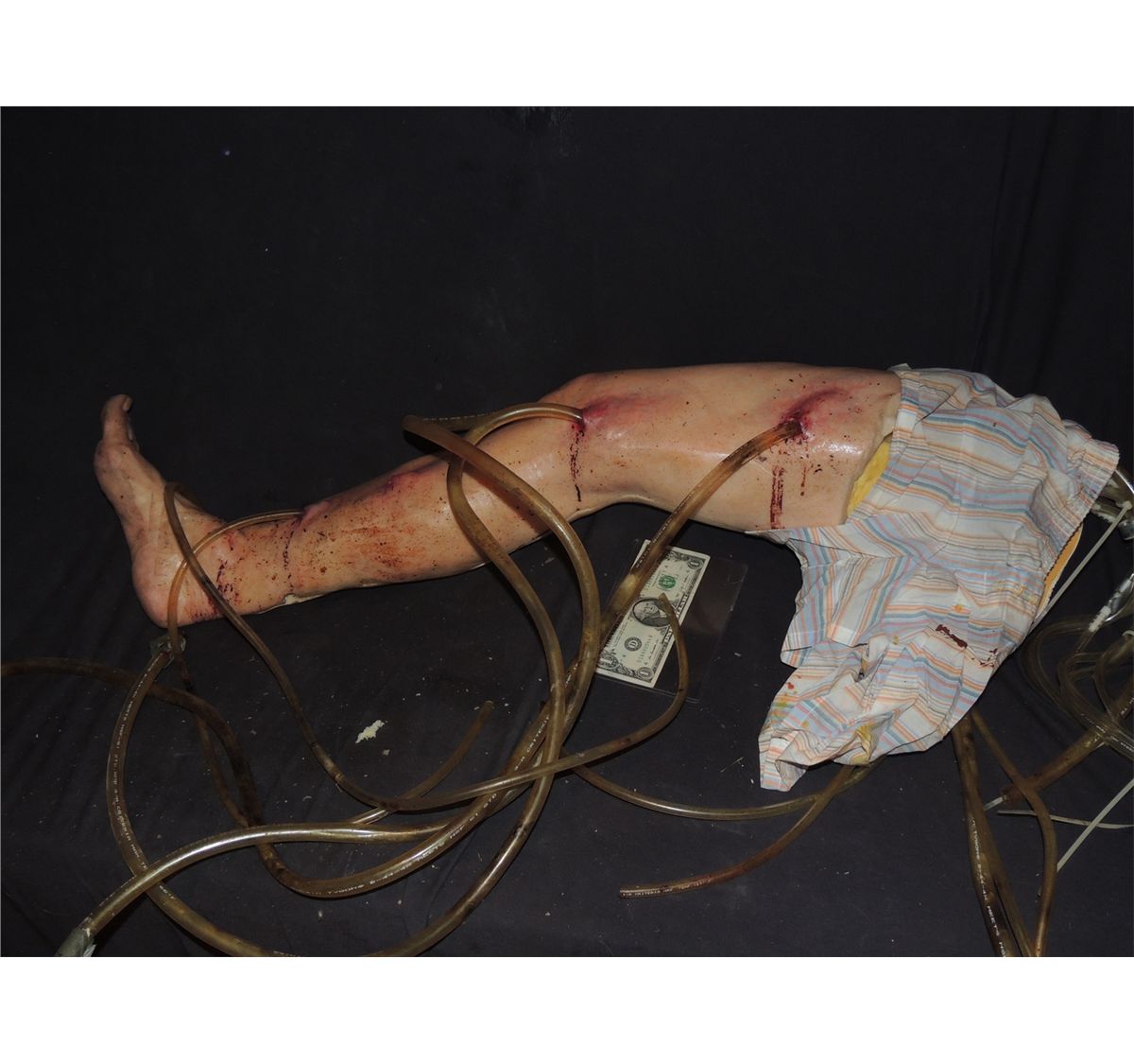 This is a severed silicone leg with several tubes pumping into it.