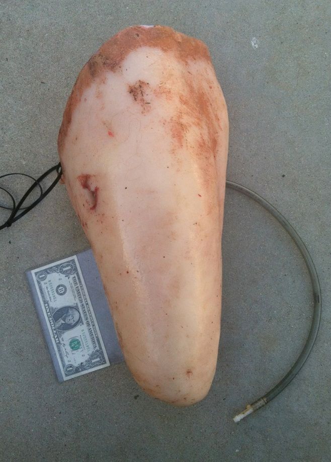 This is an incredibly cool severed silicone thigh with a gun shot wound and blood rig for use in your Haunt or Indy Film.