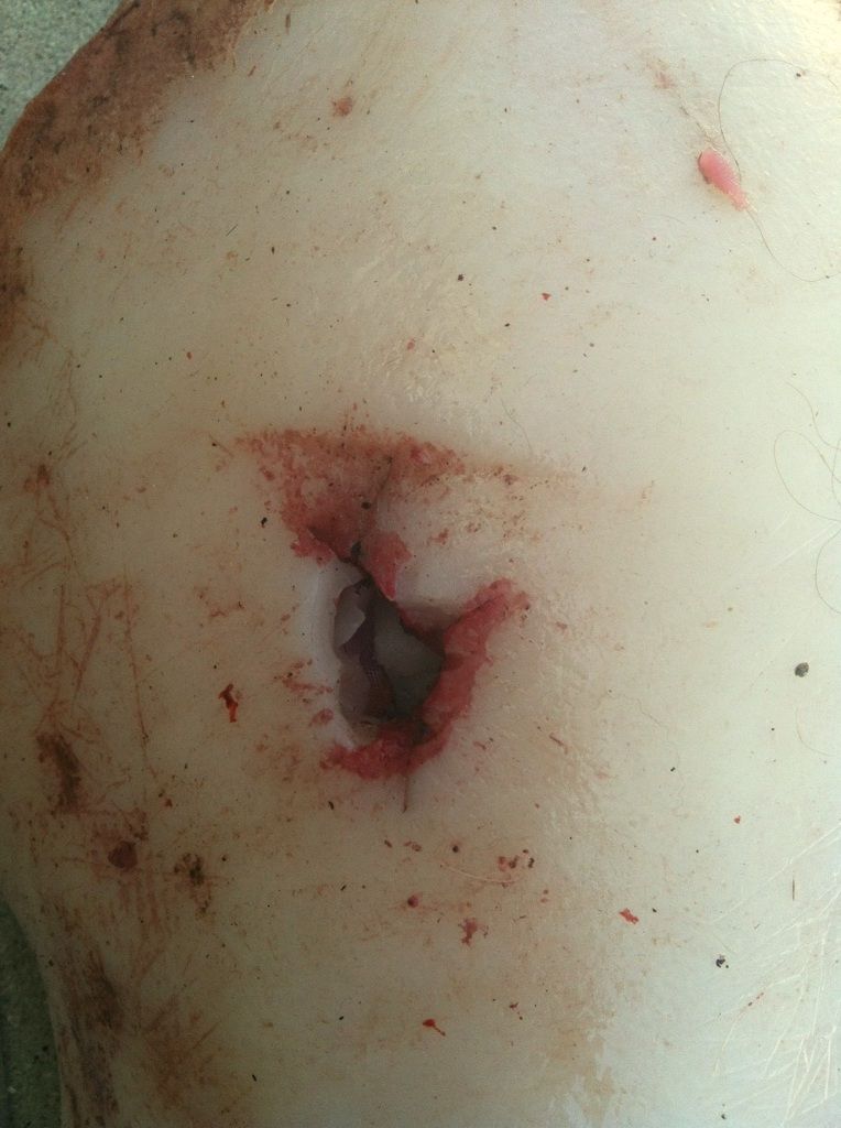 This is an incredibly cool severed silicone thigh with a gun shot wound and blood rig for use in your Haunt or Indy Film.