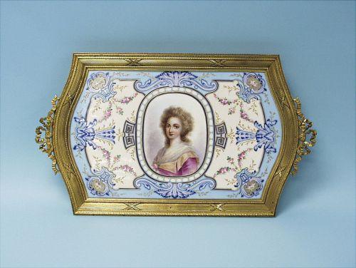 SEVRES, France - A rare 19th century bronze mounted porcelain tray with hand painted romantic motifs in pastel colours surrounding a central medallion. Approx. 17" x 9".