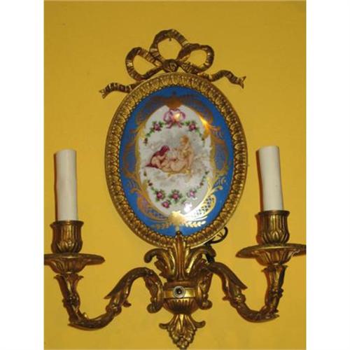 A FABULOUS PAIR OF GILT METAL DOUBLE WALL SCONCES WITH A HAND PAINTED SEVRES CENTER PLAQUE. THESE WERE MADE CA 1890 IN FRANCE AND ARE IN GOOD CONDITION.