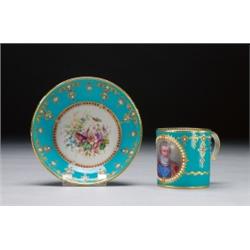 SEVRES 'JEWELLED' TURQUOISE-GROUND, PORTRAIT CUP AND SAUCER, painted on the cup with a portrait...