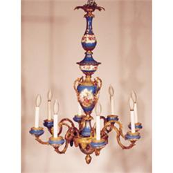 SEVRES PORCELAIN AND GILT BRONZE MOUNTED EIGHT-LIGHT CHANDELIER, first half 20th century, having eight scrolling gilt bronze arms, and an urn form porcelain column decorated with scenic reserves depicting courting couples in 18th century costume; 36 inch height; 28 inch diameter