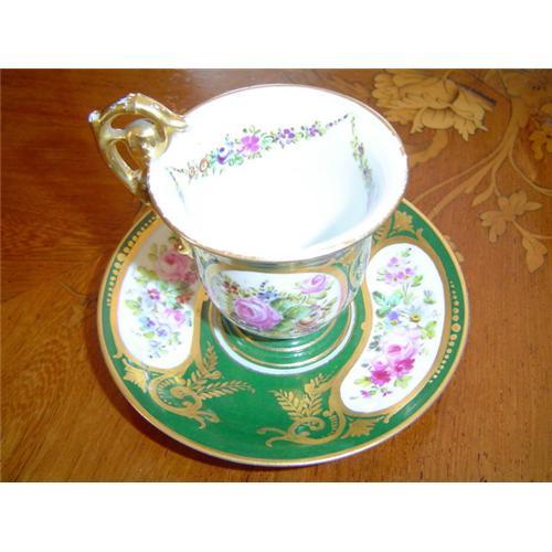 gorgeous Sevre cup and saucer , in the green with floral decor and garlands inside , circa 1870 in great condition