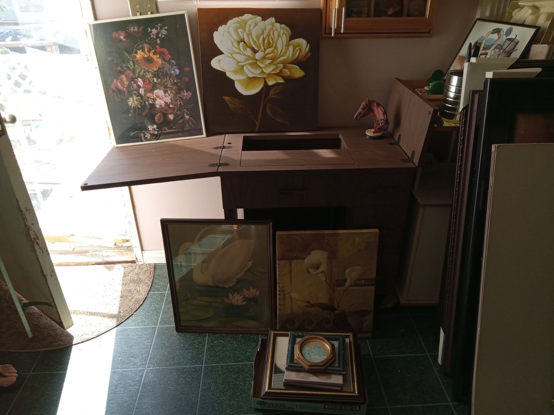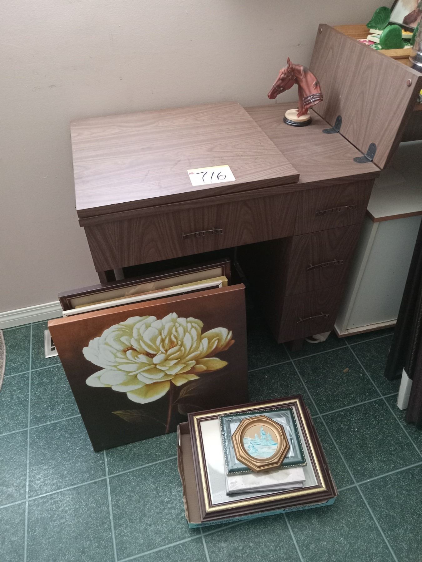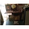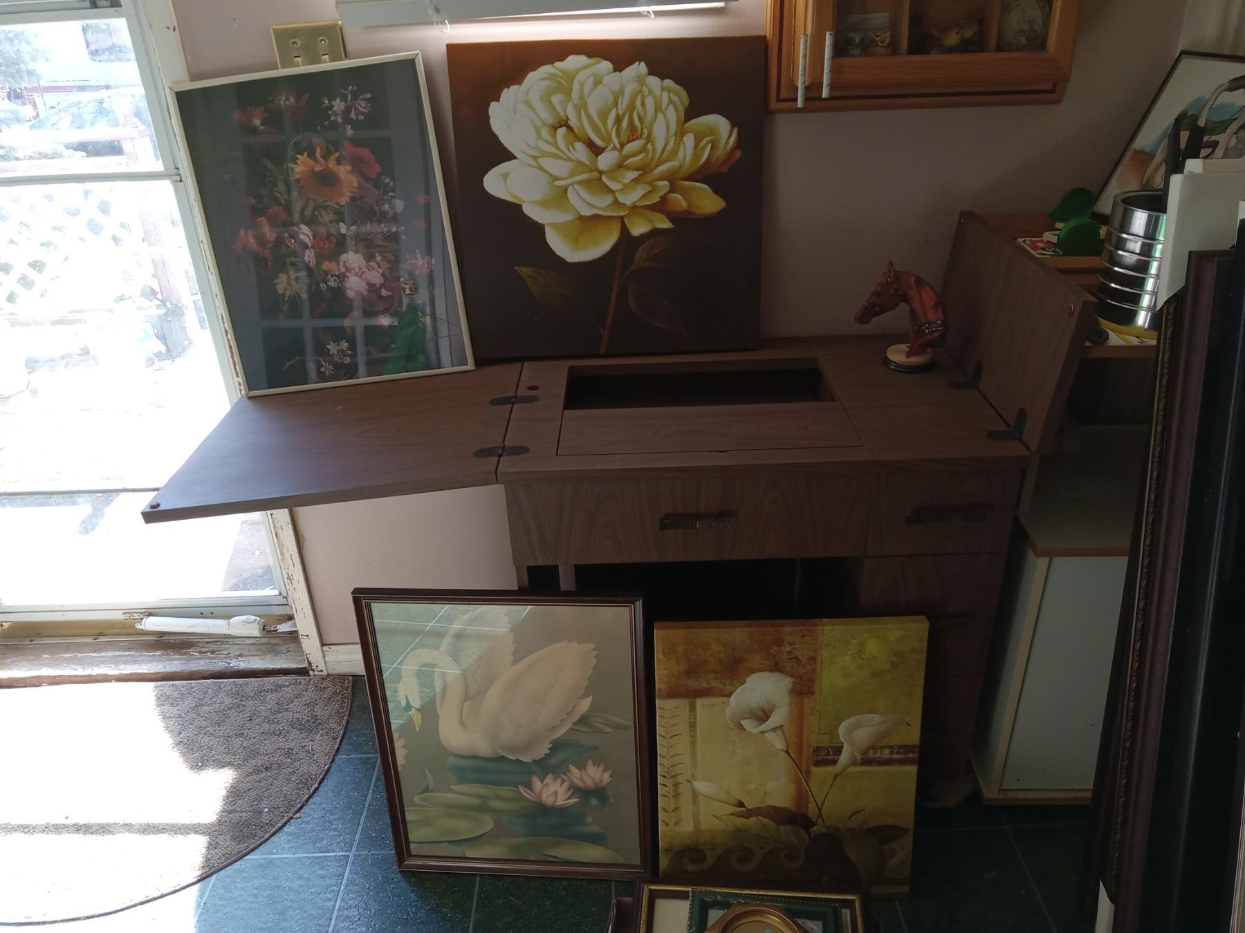 SEWING CABINET/TABLE C/W MISC. PICTURE ASSORTMENT.