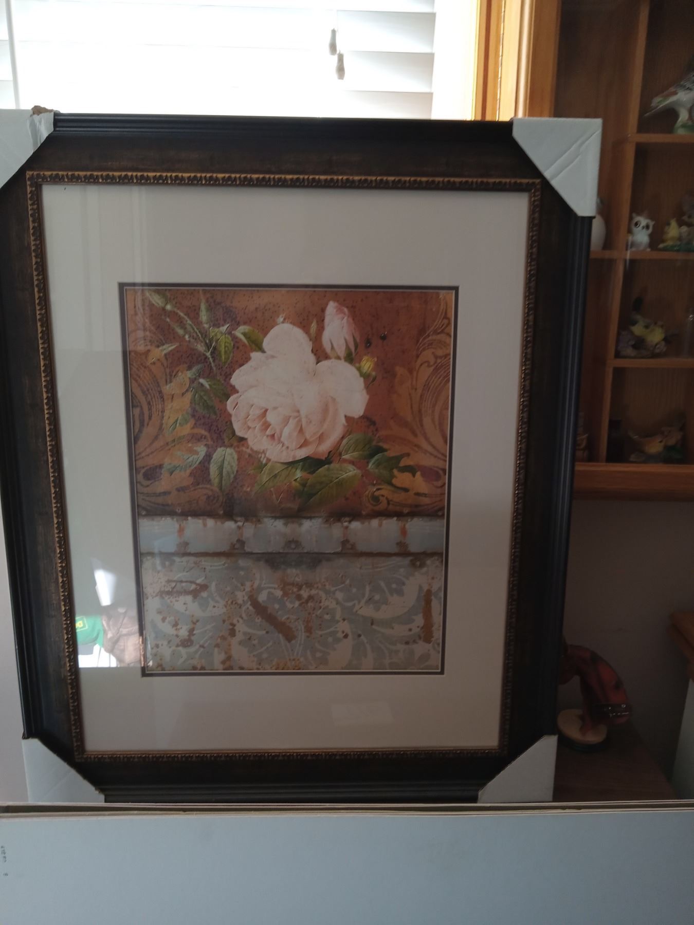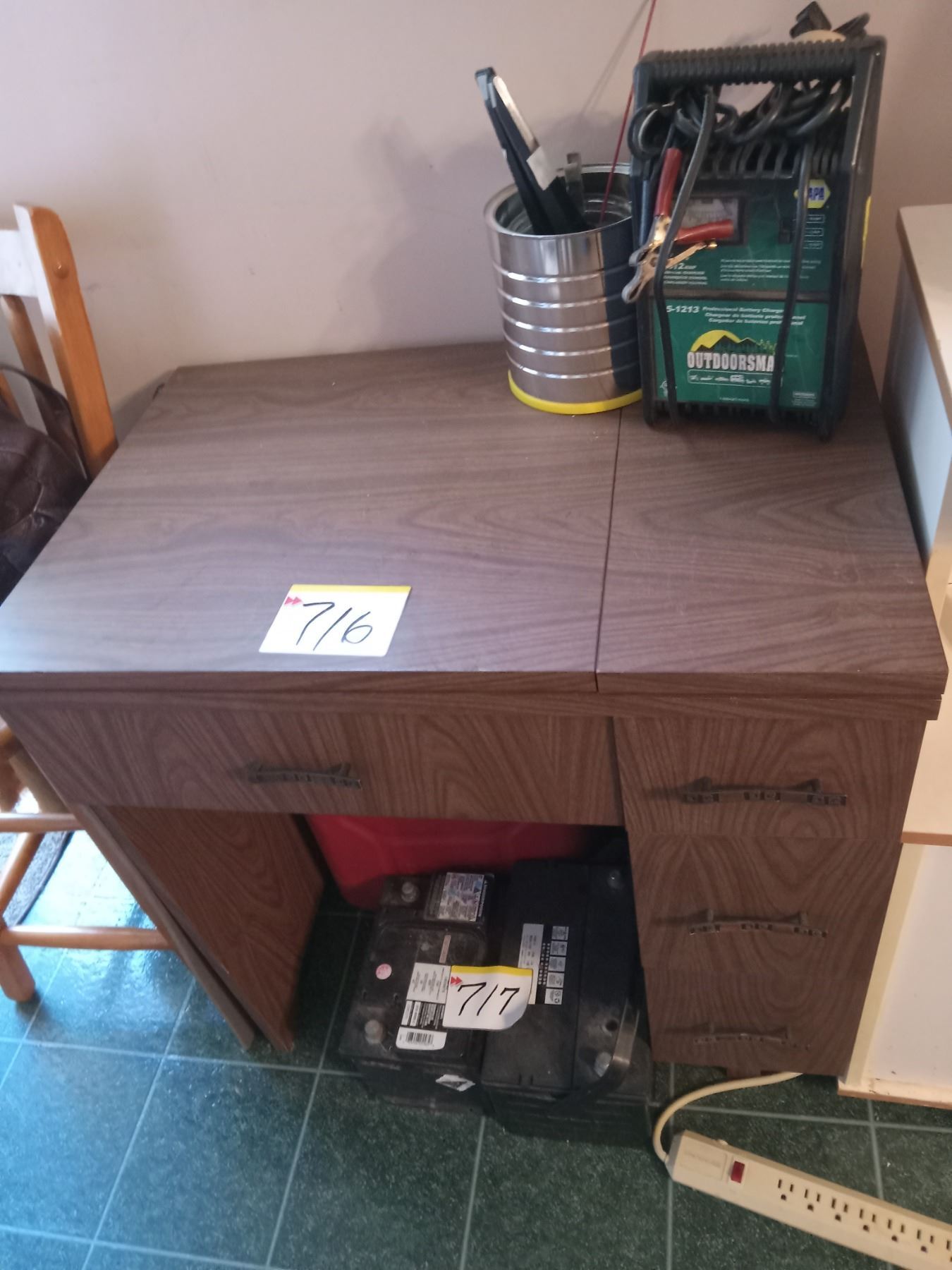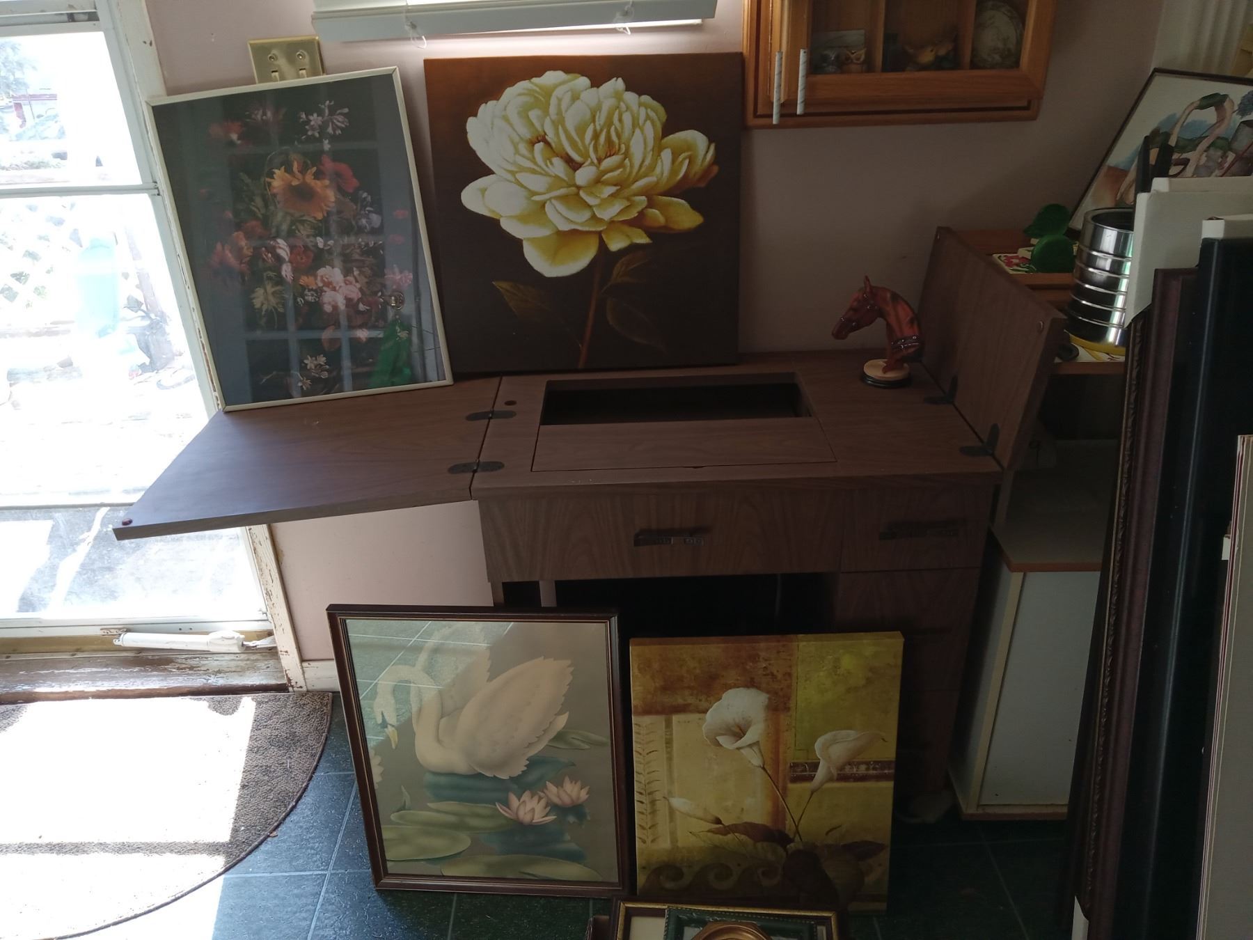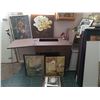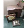 SEWING CABINET/TABLE C/W MISC. PICTURE ASSORTMENT.
