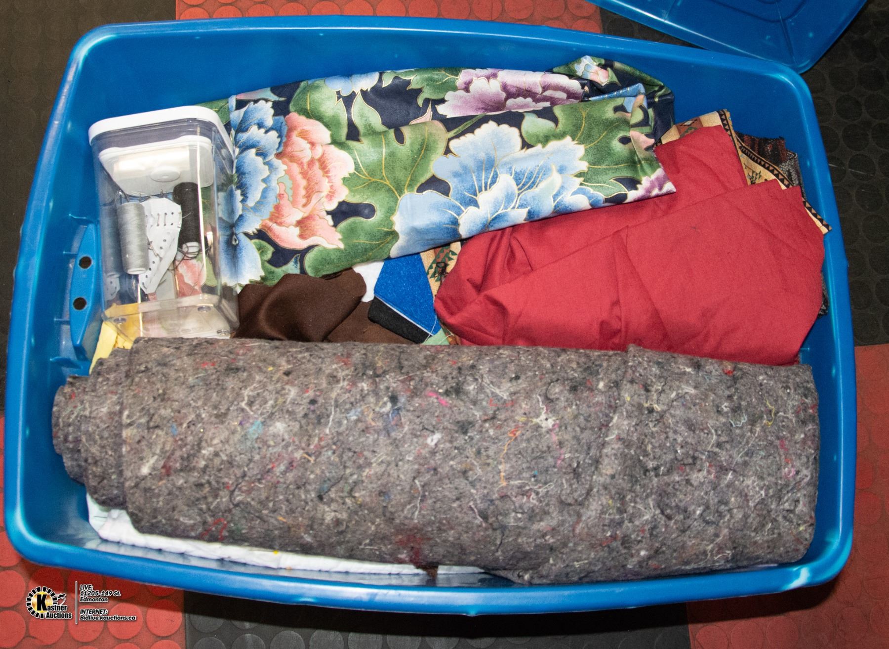 LARGE TOTE OF MISC. SEWING SUPPLIES AND FABRICS