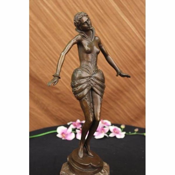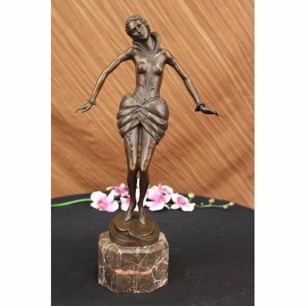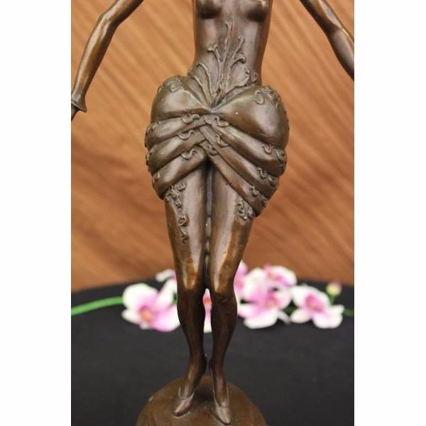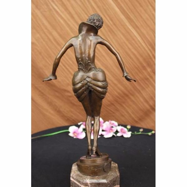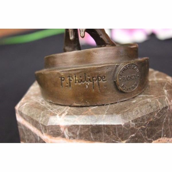 The jovial and exciting performer stands high on her little stage. The woman is dressed in a unique outfit that is embroidered with curves and designs. She has her arms playfully spread . She shrugs her head toying with the audience. She commands attention with her charisma as a performer. This piece stands on a brown marble base. This fun figurine was crafted using the lost wax method. It is signed. P. Philippe. Condition :This sculpture is in a perfect condition. Bronze Dimensions with Marble Base:Height 18" x Width 9 1/2" Marble Dimensions: Diameter 6" Height without base: 15" Weight : 12 LBS Inventory : 23X21645532