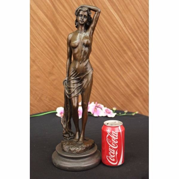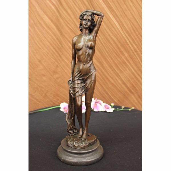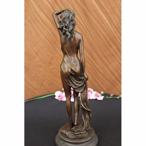 The beautiful young woman stands freely, clutching her dress in her hand. Her garments cover one side of her body exposing a breast, the side of her torso and thigh. She is carefree and composed as she gazes in deep thought. Her hand rests at the top of her head. This sculpture rests on a black marble base. It was crafted using the lost wax method. It is signed Jean Patoue. Condition:This sculpture is in perfect condition. Bronze Dimensions with Marble Base:Height 18" x Width 6" Marble Dimensions: Diameter 6". Height without base: 17 " Weight :12 LBS Inventory : 57Y6534275