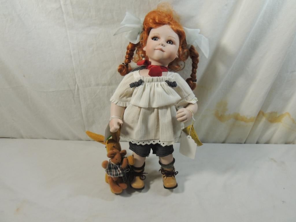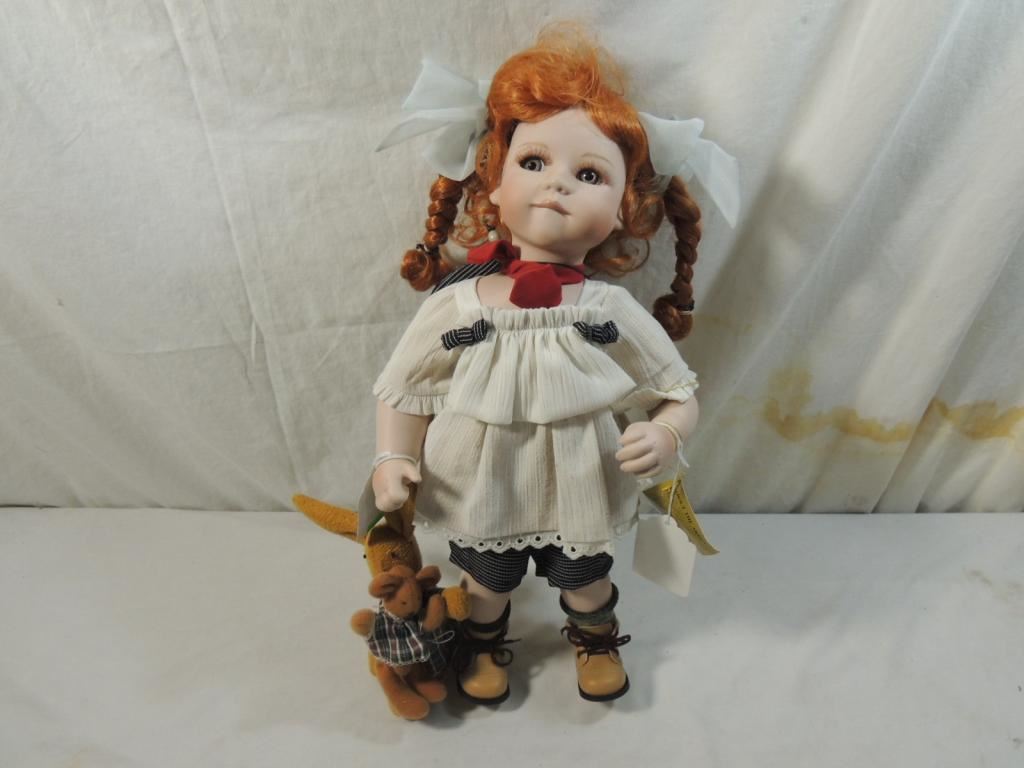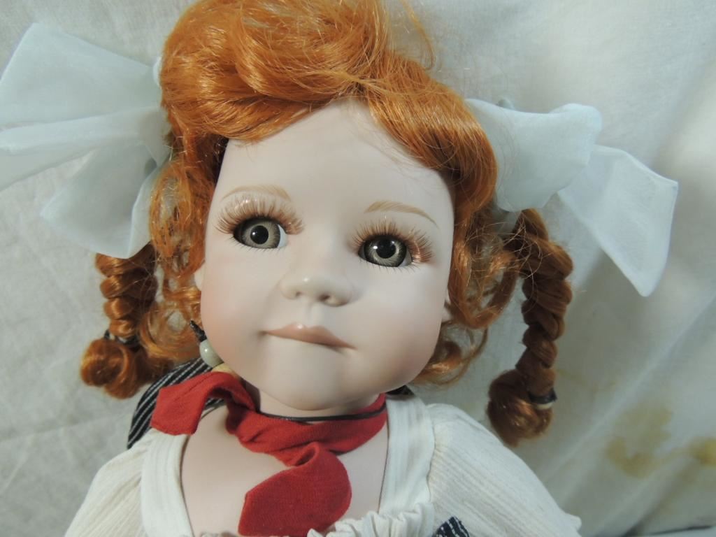 18" PORCELAIN STUFFED BODY, AWARD WINNER MINT, TAGGED, RETIRED, ARTIST: JUDITH LEE. 2000 SEYMOUR MANN. LIMITED EDITION COLLECTIBLE DOLL, DESIGNER DOLL, GOOD CONDITION, FROM PRIVATE DOLL COLLECTION, VINTAGE DOLL, AS SHOWN SEE PHOTO FOR MORE DETAILS.