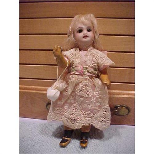 This bisque head doll is marked 301 and Paris . She has a nose rub and a small rough area under her bangs which was done in the making. It does not show when displayed. There are no breaks or hairlines in her head. Her body is the crudely made type these little dolls had. It appears to be all original . The varnish has darken a bit--see pix. She has very dark set eyes and an open mouth with tiny teeth. The clothing is sewn on and appears to be original. It is in good condition. Her mohair wig is probably original also. She has a sweet expression and is the perfect cabinet size.