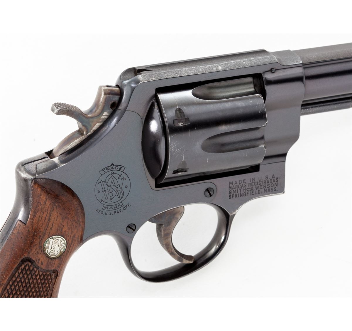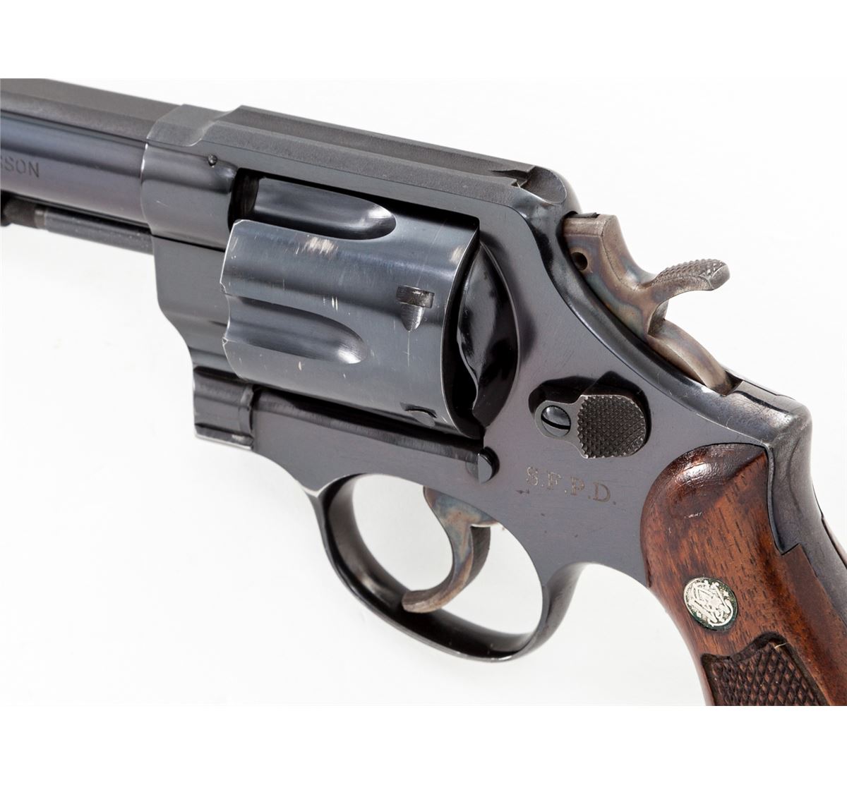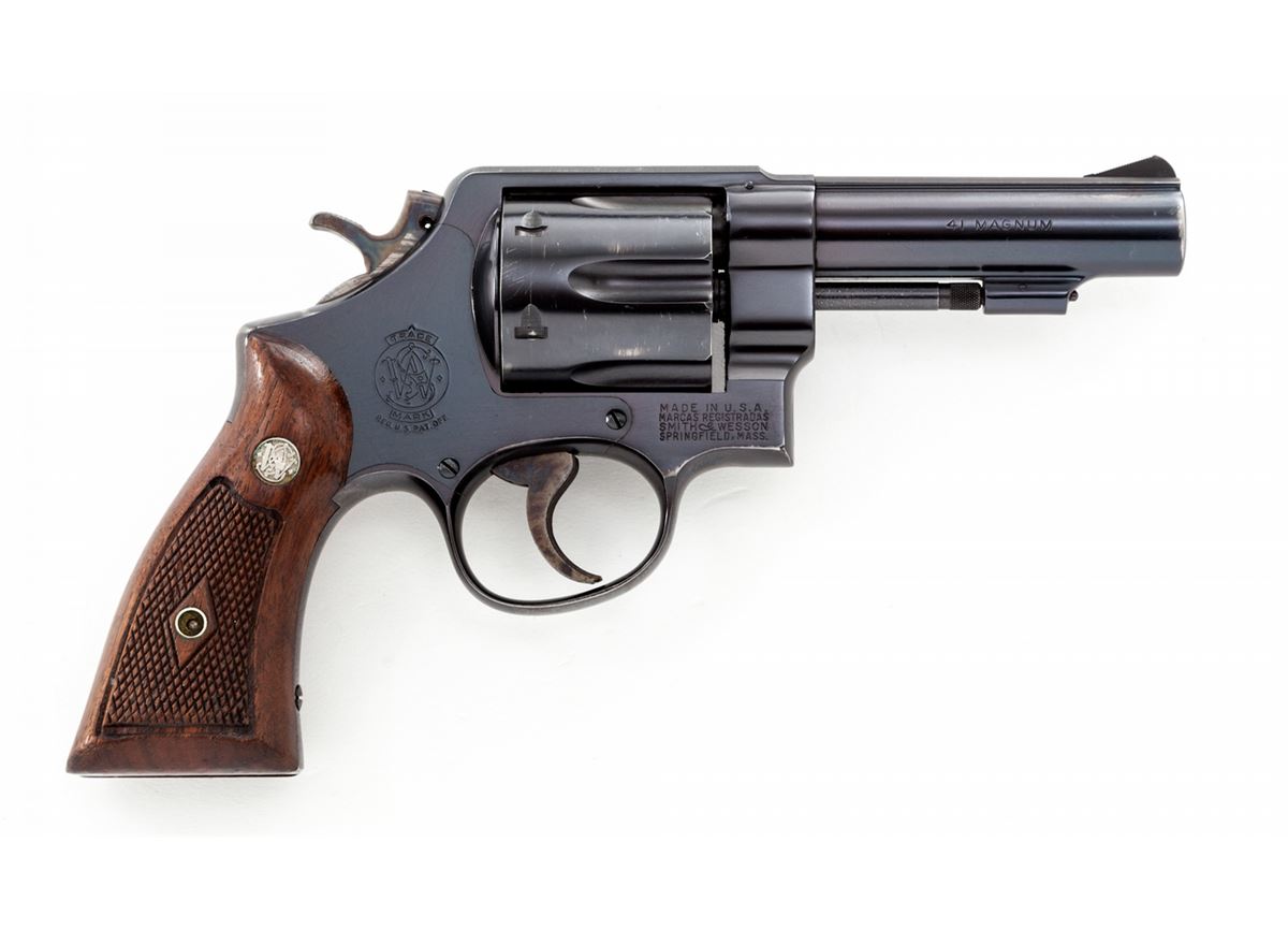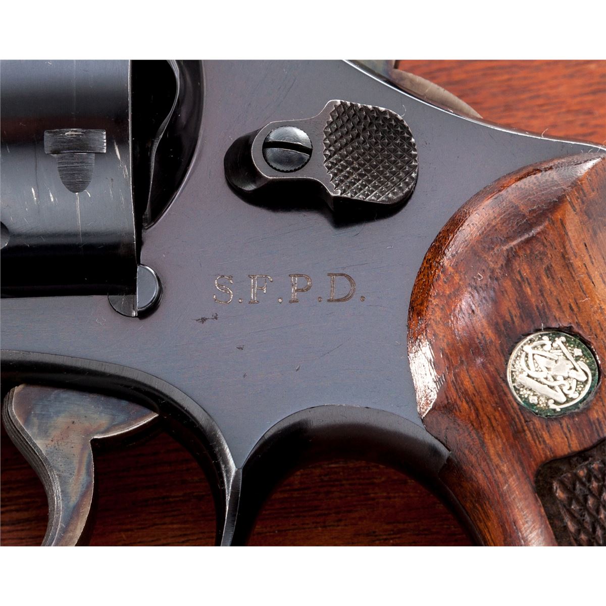 San Francisco Police Dept. marked Smith & Wesson Model 58 Double Action Revolver, #S259762, .41 mag. cal., 4'' barrel, blue finish, factory checkered walnut grips, case colored hammer and trigger, early diamond escutcheon grips and pinned barrel. Dating from approx. 1965. In slightly later mahogany case with cleaning accessories and original instructions. ''S.F.P.D.'' neatly engraved just below cylinder latch. Condition is excellent showing just light scuffs to sides of cylinder and minor wear at muzzle. Grips show minor flattening. Action remains crisp, bore is excellent. Est.: $1,200-$1,800. (Modern/PPT)