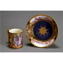 The cup painted with a couple in an interior, the saucer with landscape vignettes, each with 'jeweled' borders and gilt decorated bandings on a cobalt blue ground. Each with blue painted interlaced L's mark enclosing a C. Staple repairs to handle; some losses to 'jewels'.