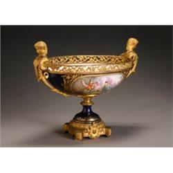 SFvres-Type Ormolu Mounted Centerpiece, Circa 1900, The oval bowl polychrome decorated with t...