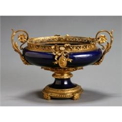 SFvres-Type Ormolu Mounted Centerpiece, First Quarter 20th Century, The cobalt blue oval bowl...