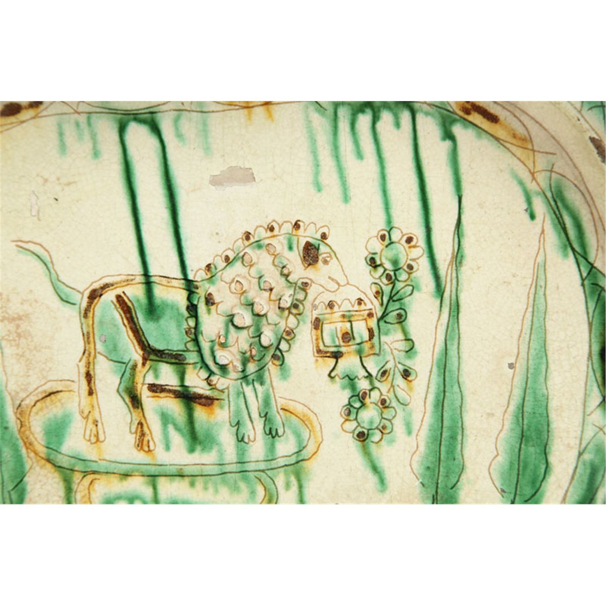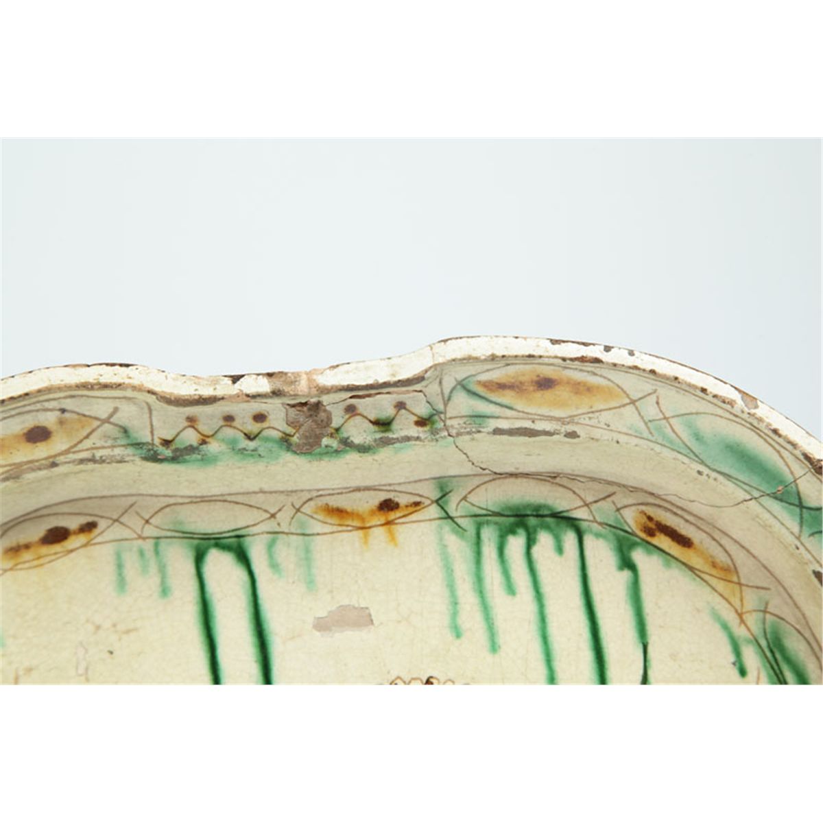 Possibly Persia and before 1600. Yellow glaze with sgraffito decoration and copper oxide drizzles. Repair. 11 1/2"l.