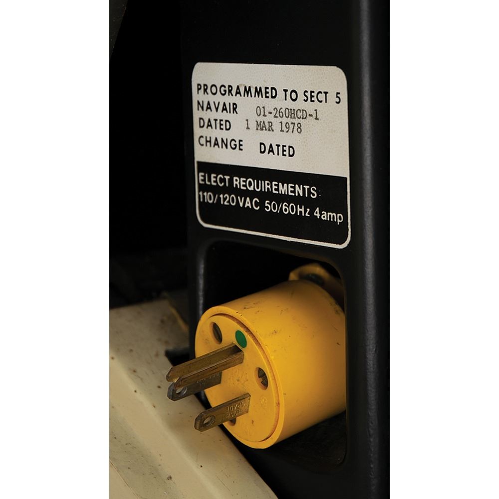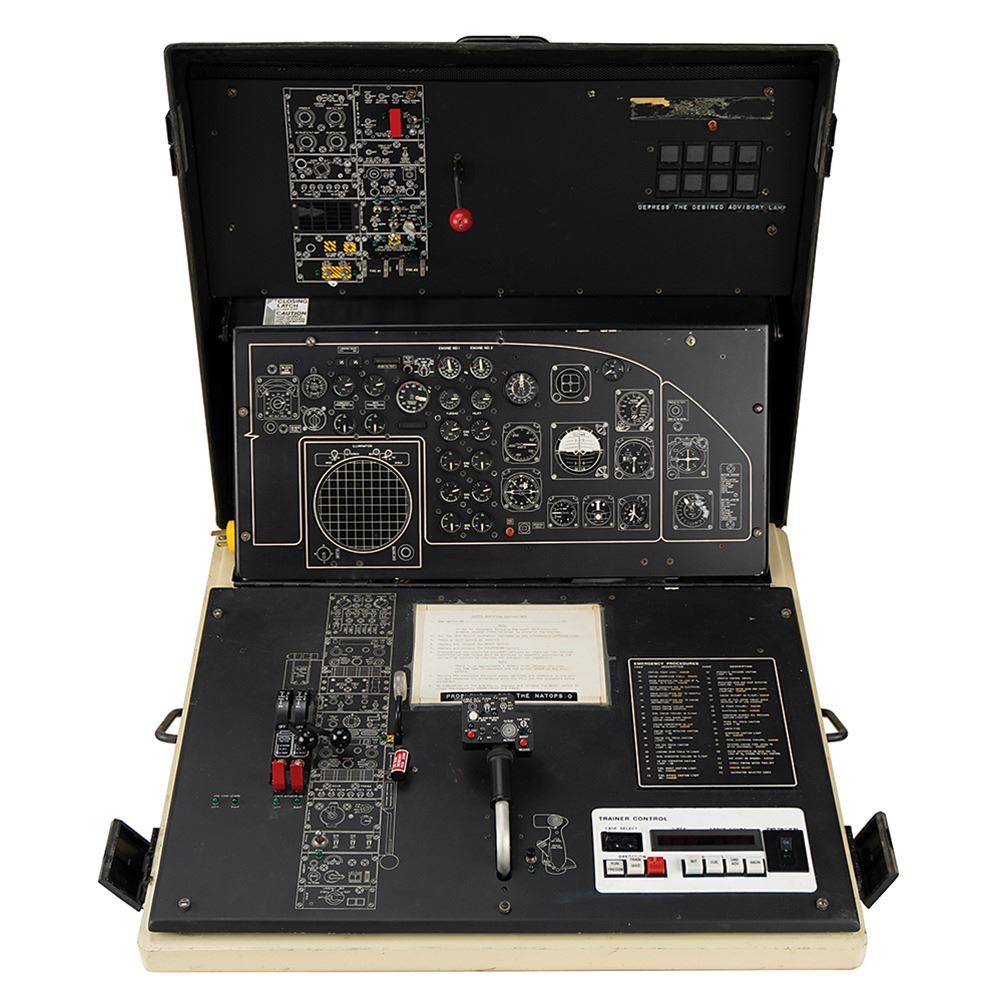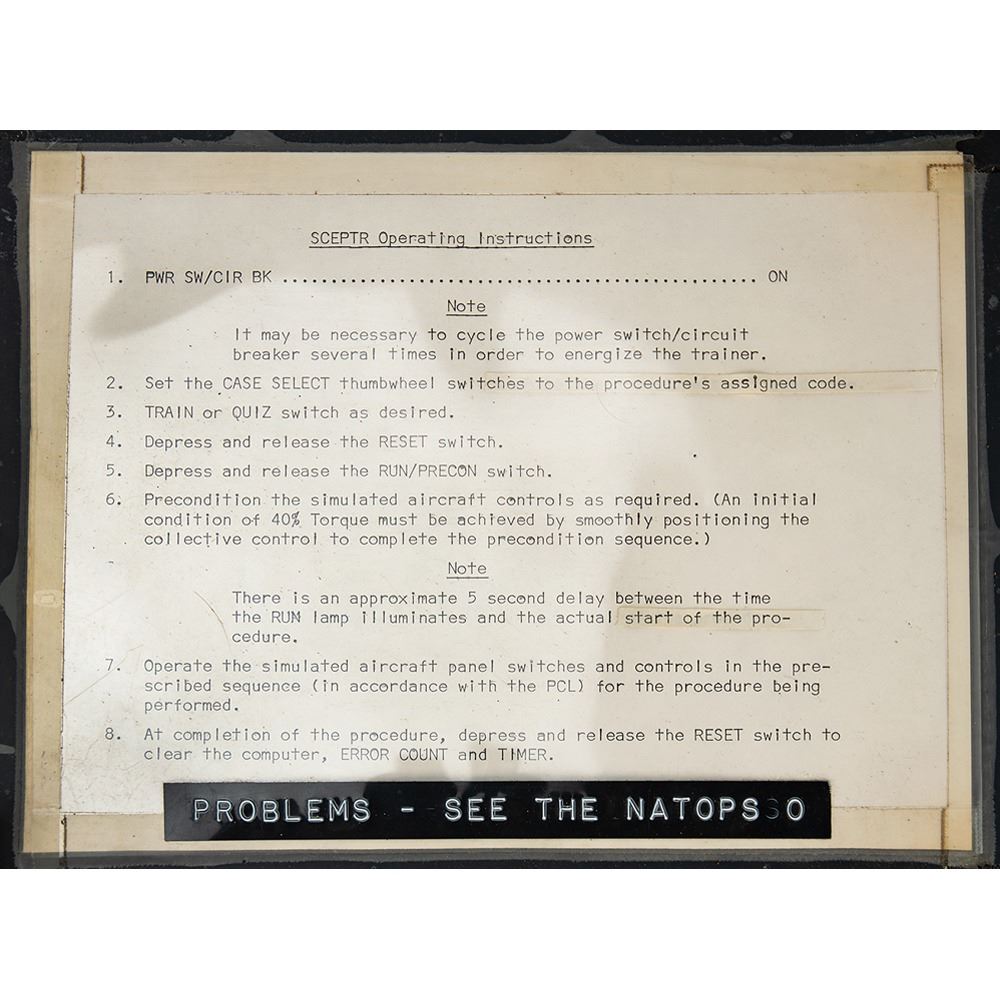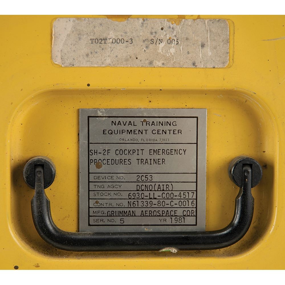 Military-grade SH-2F Helicopter Suitcase Emergency Procedure Trainer (SCEPTR Flight Simulator) made by the Grumman Aerospace Corporation for the Naval Training Equipment Center. The large yellow suitcase, measuring 26" x 15" x 20.5" and weighing roughly 70.5 pounds, features a parts plate to the front: "Naval Training Equipment Center, Orlando, Florida…SH-2F Cockpit Emergency Procedures Trainer, Device No. 2C53, Tng. Agcy. DCNO (Air), Stock No. 6930-LL-C00-4517, Contr. No. N61339-80-C-0016, Mfg. Grumman Aerospace Cor., Ser. No. 5, Yr 1981." Above is an affixed label, "T02T…0003, S/N 005" and a U.S. Navy Property tag: "Accounting No. 246, 032816." When opened, the SCEPTR stands to a height of 34" and displays similar to an arcade console, with upper, middle, and lower sections featuring the various requisite controls and reference diagrams and instructions for flight simulation. The bottom section contains levers, a trainer control panel, an emergency procedures list, and a taped-on "SCEPTR Operating Instructions" guide; the middle is composed of numerous working and non-working meters, with the operational meters related to the two-engine performance; the top section bears an another lever with switches and additional control diagrams. The right side features a three-prong power cord with upper parts label: "Programmed to Sect 5, Navair 01-26OHCD-1, Dated 1 Mar 1978…Elect Requirements 110/120 VAC 50/60Hz 4 amp." Includes a pair of Grumman / SCEPT plates that have become detached from the SCEPTR. In untested working condition; consignor notes that the machine will need repairs to become fully functional.