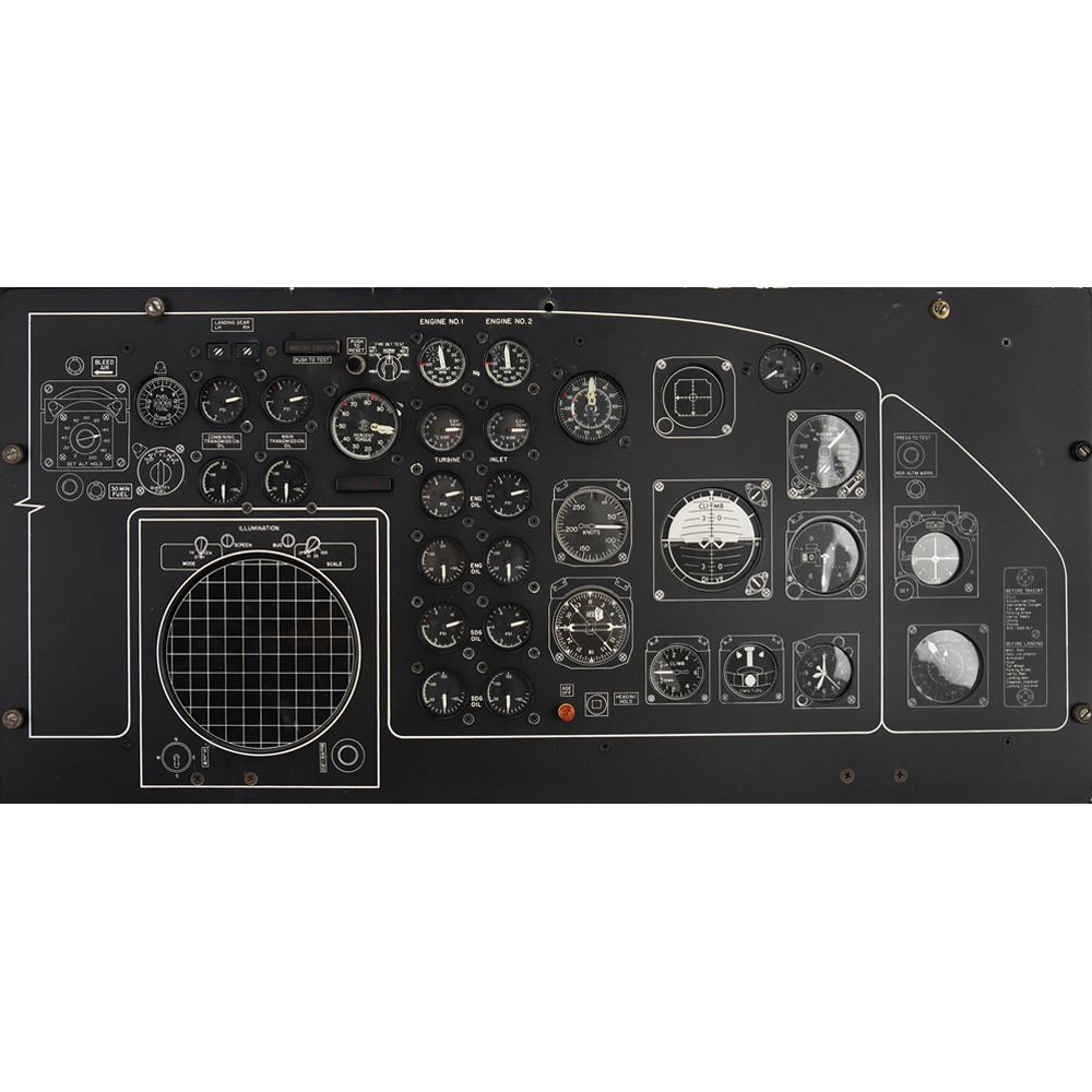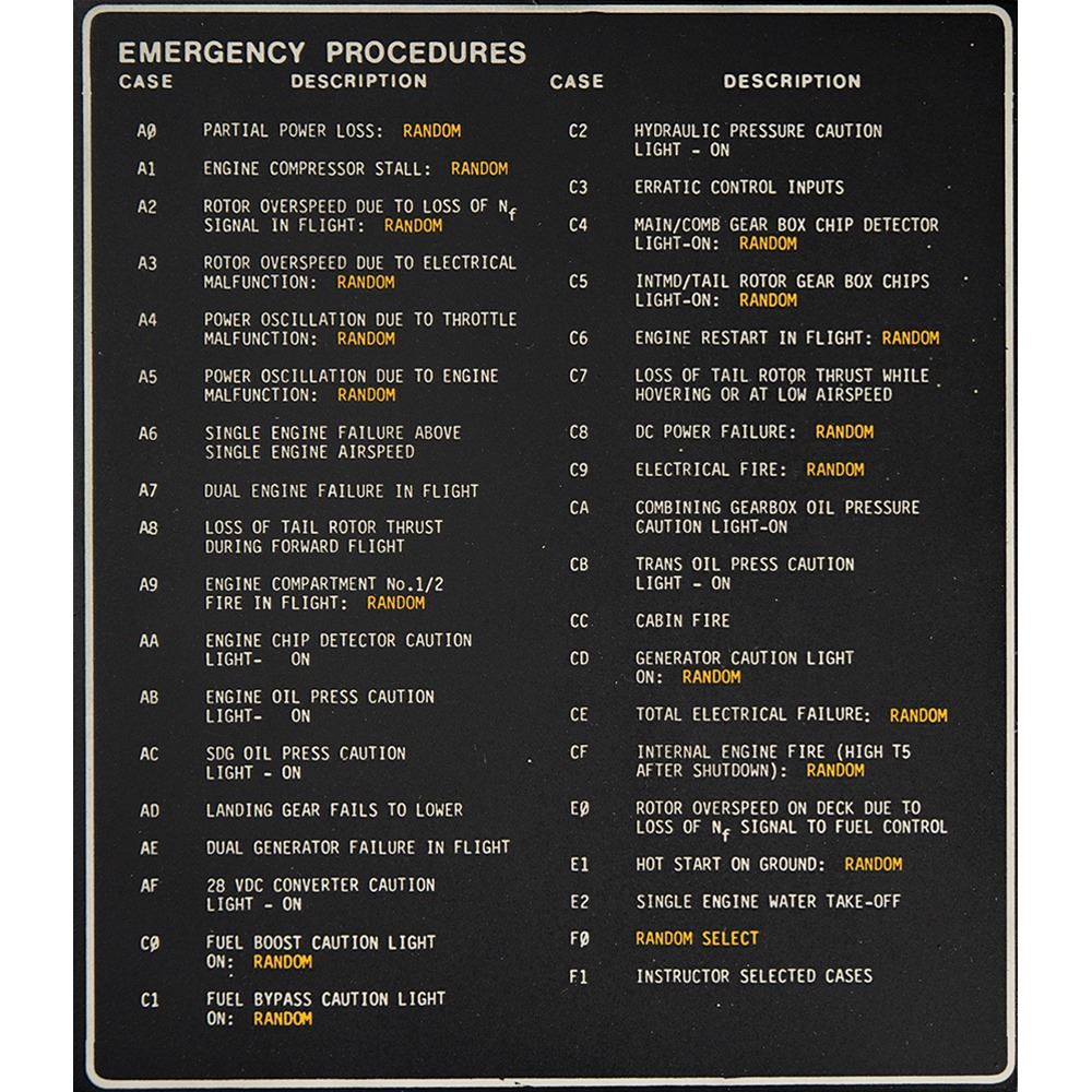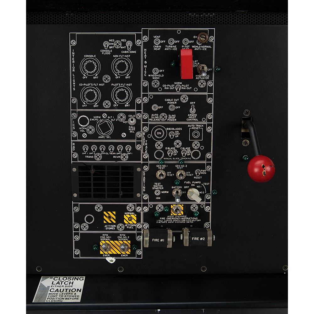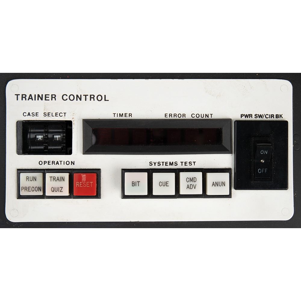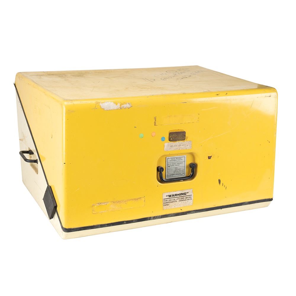 Military-grade SH-2F Helicopter Suitcase Emergency Procedure Trainer (SCEPTR Flight Simulator) made by the Grumman Aerospace Corporation for the Naval Training Equipment Center. The large yellow suitcase, measuring 26" x 15" x 20.5" and weighing roughly 70.5 pounds, features a parts plate to the front: "Naval Training Equipment Center, Orlando, Florida…SH-2F Cockpit Emergency Procedures Trainer, Device No. 2C53, Tng. Agcy. DCNO (Air), Stock No. 6930-LL-C00-4517, Contr. No. N61339-80-C-0016, Mfg. Grumman Aerospace Cor., Ser. No. 5, Yr 1981." Above is an affixed label, "T02T…0003, S/N 005" and a U.S. Navy Property tag: "Accounting No. 246, 032816." When opened, the SCEPTR stands to a height of 34" and displays similar to an arcade console, with upper, middle, and lower sections featuring the various requisite controls and reference diagrams and instructions for flight simulation. The bottom section contains levers, a trainer control panel, an emergency procedures list, and a taped-on "SCEPTR Operating Instructions" guide; the middle is composed of numerous working and non-working meters, with the operational meters related to the two-engine performance; the top section bears an another lever with switches and additional control diagrams. The right side features a three-prong power cord with upper parts label: "Programmed to Sect 5, Navair 01-26OHCD-1, Dated 1 Mar 1978…Elect Requirements 110/120 VAC 50/60Hz 4 amp." Includes a pair of Grumman / SCEPT plates that have become detached from the SCEPTR. In untested working condition; consignor notes that the machine will need repairs to become fully functional.