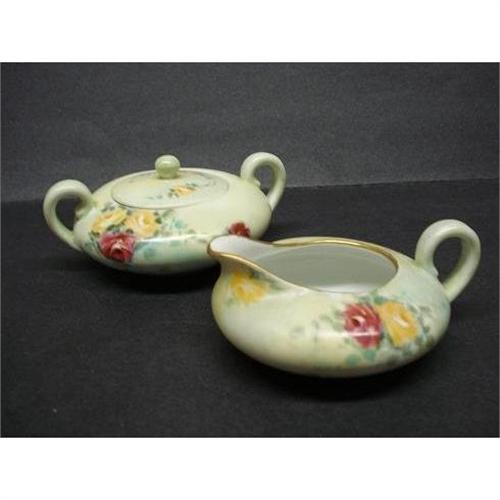 BEAUTIFUL CREAM AND SUGAR SET,IT IS NOT STAMPED BUT TO ME IT LOOKS LIKE BAVARIA,FROM EARLY 1900's, PLEASE NOTE THE CUTEST SHAPE OF THE BOTH PIECES, EXCELLENT CONDITION,CREAMER STANDS ABOUT 2" HIGH AND FROM SPOUT TO HANDLE ABOUT 4 1/2",  SUGAR BOWL 2 1/4" HIGH AND FROM HANDLE TO HANDLE ABOUT ABOUT 5" WIDE, US BUYER TO PAY 7.00 FOR SHIPPING PLUS INSURANCE.THANKS.