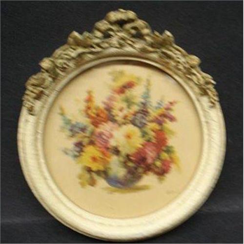 VERY PRETTY ROUND PICTURE, WITH GORGEOUS FRAME, DISPLAYING ROSES AND FLOWERS IN THE VASE AND SIGNED M. BLACK, THIS IS OLD PRINT,as per images, EXCELLENT CONDITION FOR IT'S AGE, THERE IS A SMALL SPOT WITH PAINT LOSS,MEASURES ABOUT 7" X 6", US BUYER TO PAY 8.00 FOR SHIPPING PLUS INSURANCE.THANKS.