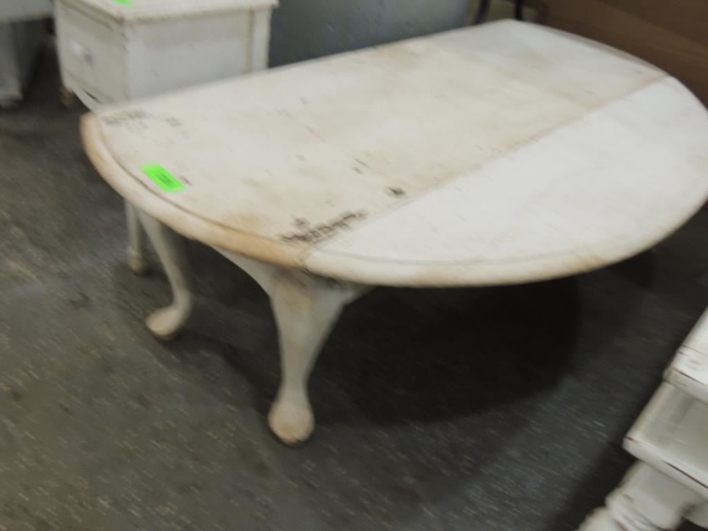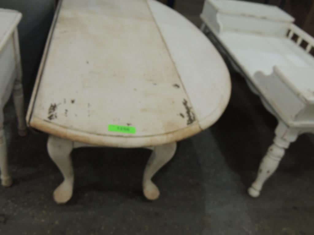 LOW WHITE WOODEN COFFEE TABLE, OVAL TABLE DROP SIDES, VINTAGE TABLE, SHABBY CHIC TABLE AS SHOWN SEE PHOTO FOR MORE DETAILS.