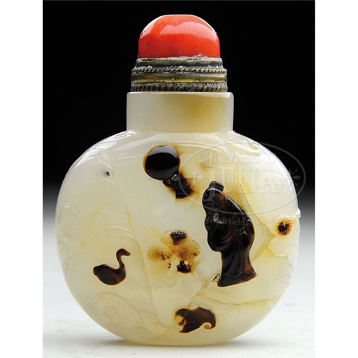 20th century, China. Well hollowed. Scene of a scholar in a garden. With top. SIZE: 2-1/8" t. CONDITION: Numerous fissures. 7-70487