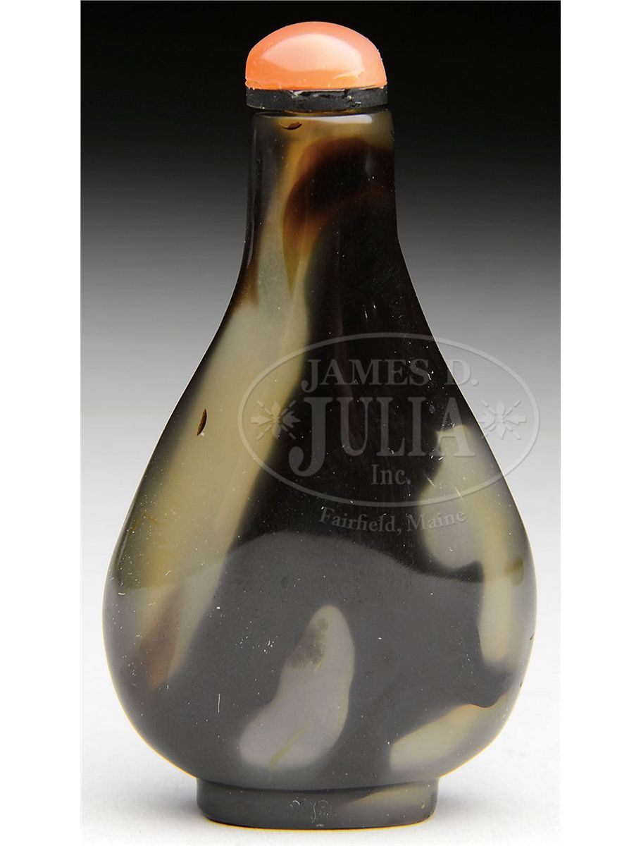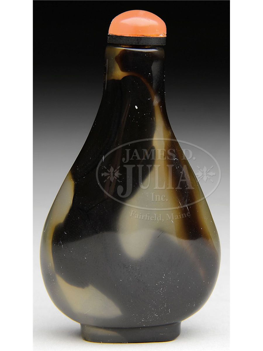 19th century, China. Pear shaped. Very well hollowed. Stone is finely marked with dramatic contrast. With top. SIZE: 2-1/4" t. CONDITION: Very good. 7-74209