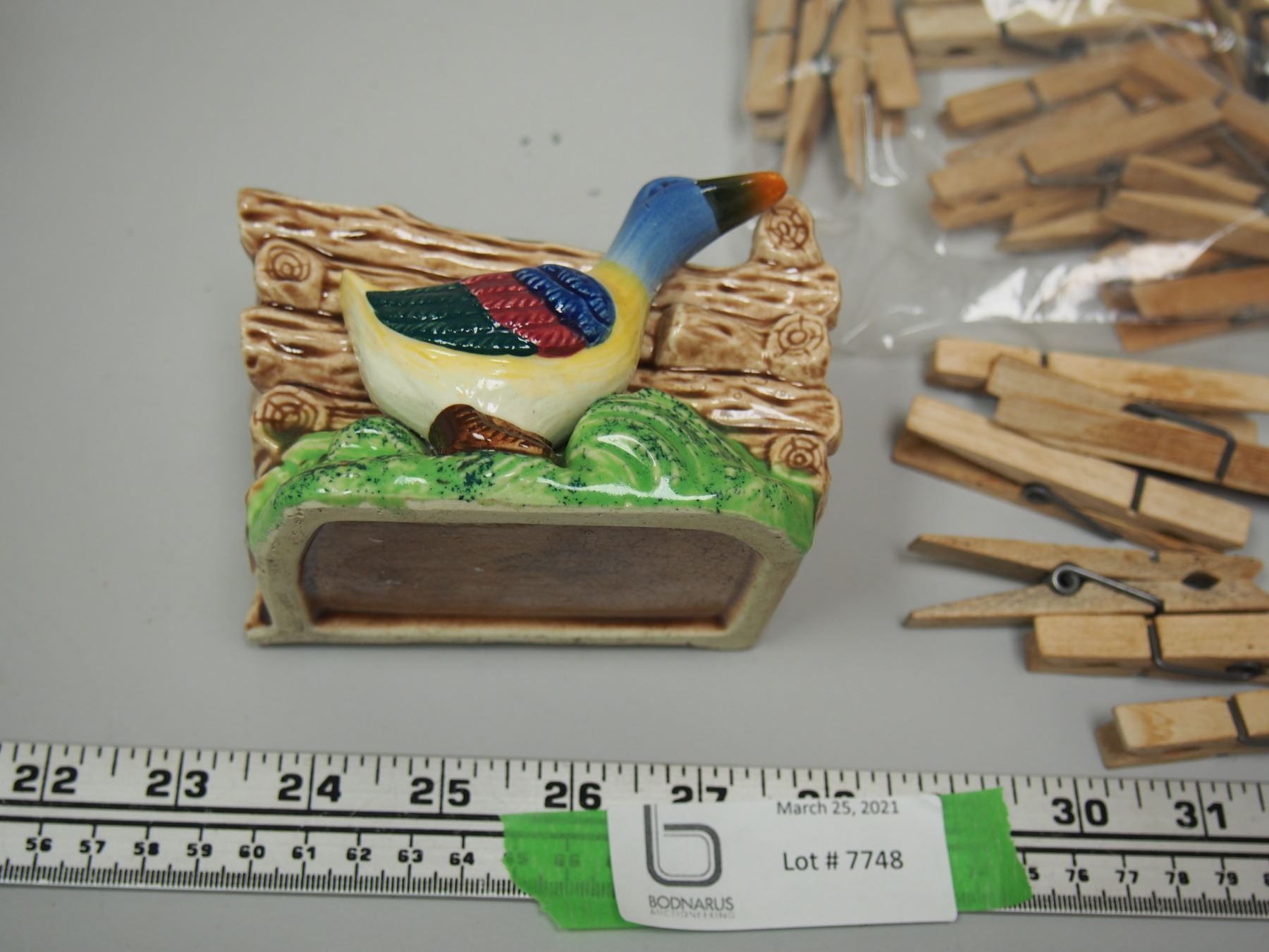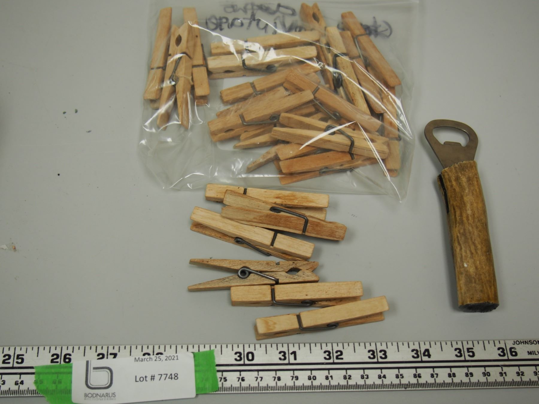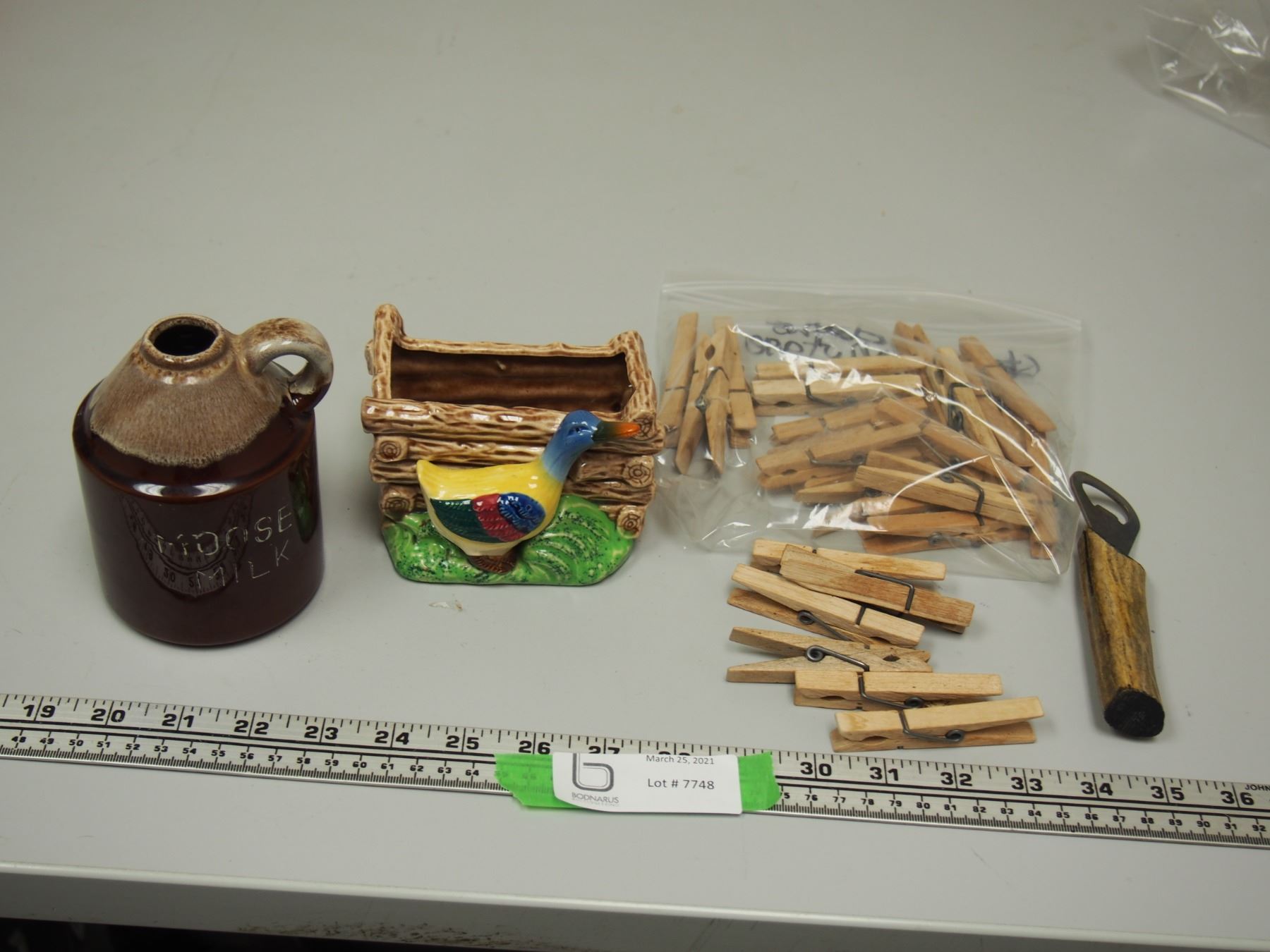 SHAFFORD ORNAMENT, MOOSE MILK JUG, WOODEN CLOTHES PINS, UNIQUE BOTTLE CAP OPENER