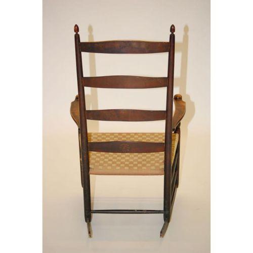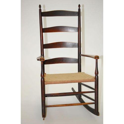 SHAKER NO. 6 ROCKING LADDERBACK ARMCHAIR W/ POINTED FINIALS, 4 SHAPED RUNGS, CAPPED BOWED ARMS & TAPERED SEAT-SIGNED SHAKER'S NO. 6, MT. LEBANON NY; IN THE ORIGINAL FINISH (41 3/4" T X 24" W X 23" D) - WEAR, IMPERFECTIONS