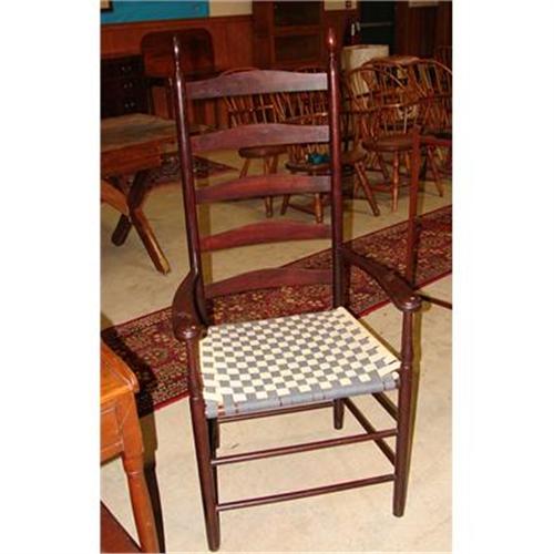 SHAKER STYLE LADDER BACK ARM CHAIR. Flag bottom seat. 51” H to top of back