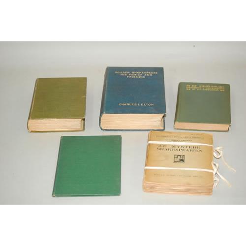 SHAKESPEARE - WITH SIGNATURE OF WILLIAM STONE BOOTH. A Group of 5 Volumes as Listed. Good to Very Good condition. All but the last, are hard covers. ***William Shakespeare His Family and Friends by Charles Isaac Elton, with Memoir of the Author by Andrew Lang. (1904) NY: E. P. Dutton. ***Who Was Shakespeare? An Appeal to Fact and Reason by Professor Gustave Holzer. (nd) London: Robert Banks & Son. ***In re Shakespeare, Beeching v. Greenwood. Rejoinder on Behalf of the Defendant by G.G. Greenwood. (1909) London: John Lane The Bodley Head. With marginalia in pencil by Booth. ***Studies in Shakespeare by J. Churton Collins. (1904) Westminster: Archibald Constable & Co. Ltd. ***Le Mystere Shakespearien by Georges Connes. (1926) Paris: Boivin & cie.