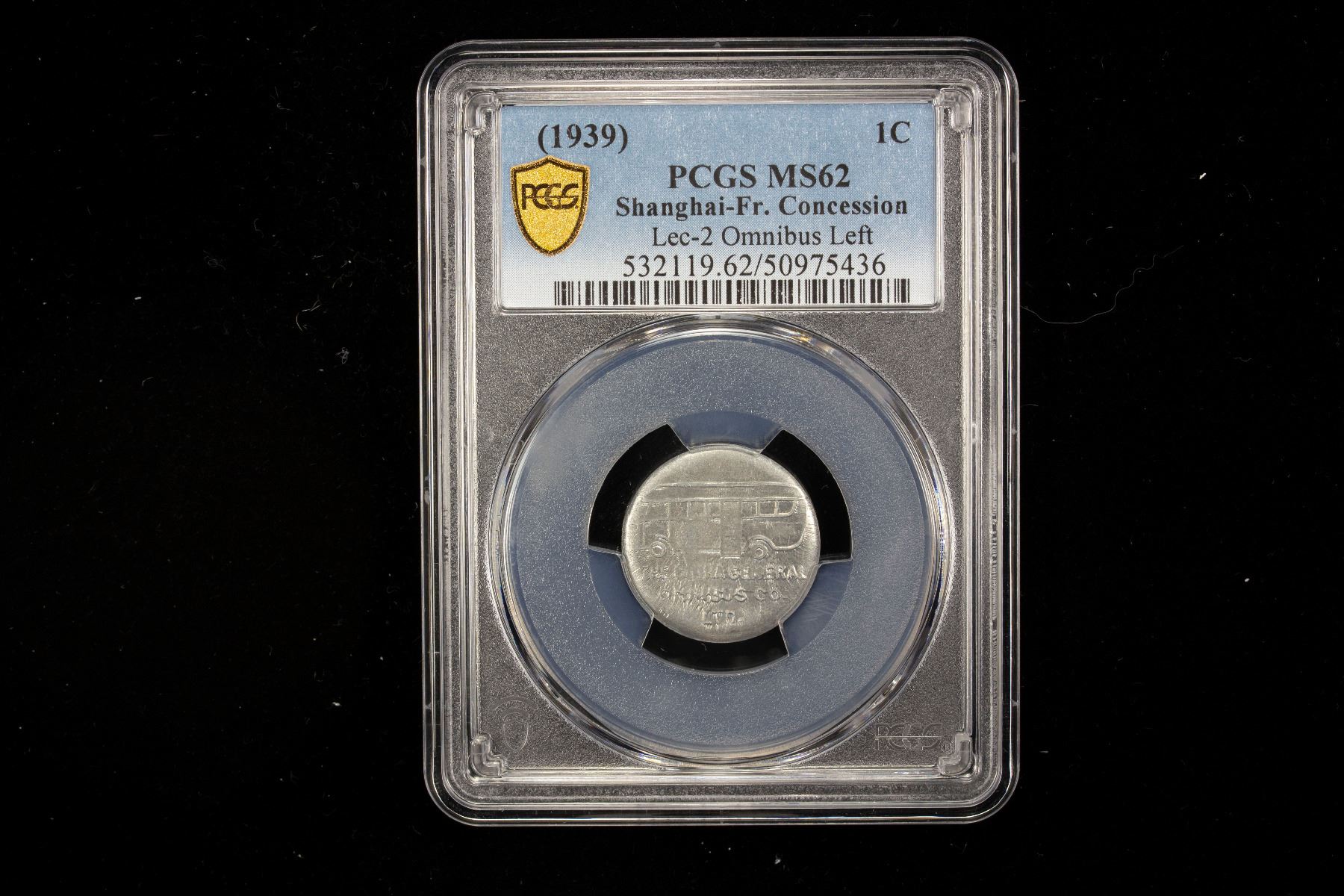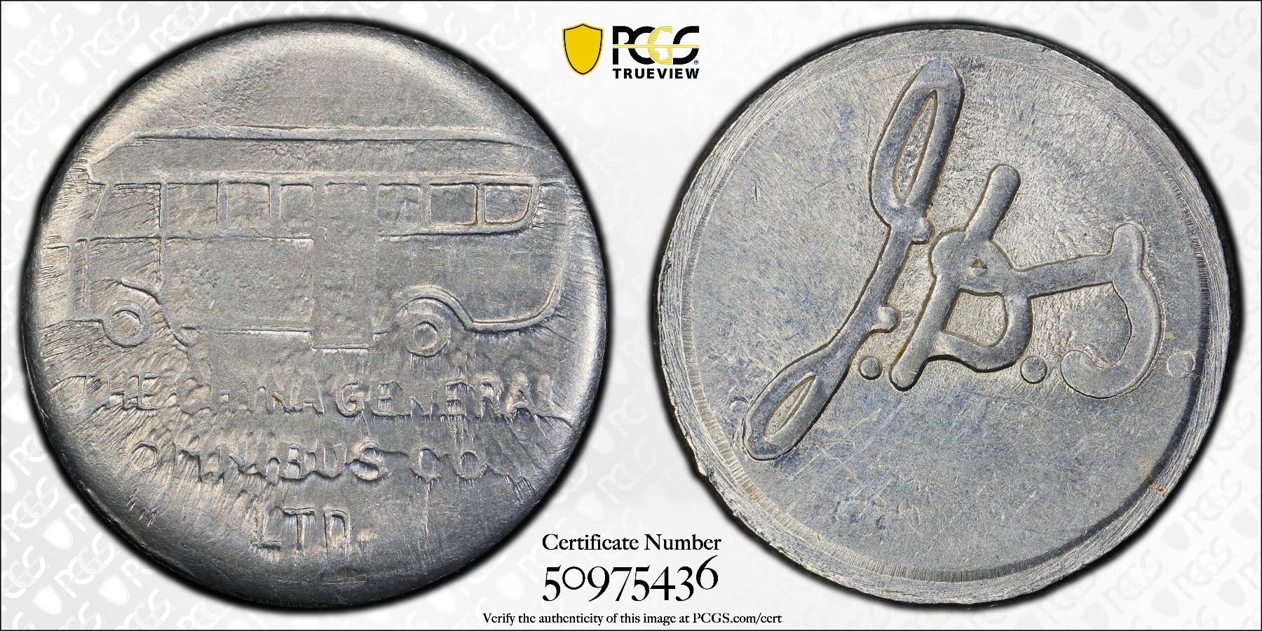 SHANGHAI: French Concession, 1 cent token, ND (1939), Lec-2, WTTP-720-BH, TC-162978, THE CHINA GENERAL / OMNIBUS CO. / LTD. below omnibus left // cursive JDS monogram, struck circa 1939, a pleasing mint state example, PCGS graded MS62, ex Hong Kong Coin Auction 40, Lot 747 (part), from a collection of tokens and medals formed by D.M. Melnikoff in Hankow, China before World War II. The China General Omnibus Co., Ltd. was a British-owned bus company established in 1923 by H. E. Arnhold, a prominent British businessman and one-time chairman of the Shanghai Municipal Council. The company was registered in Hong Kong but operated exclusively in Shanghai, where it opened to the public in October of 1924. It initially comprised six vehicles and serviced a single 6km route between the Bund and Jing'an Temple within the International Settlement. The company was later acquired by the Sassoon family and expanded to about 20 routes with a total distance of more than 100km. In 1940, these pieces were used primarily for general circulation as small change, which had disappeared after the Japanese occupied Shanghai in 1937. The initials are those of the manager, John D. Shotter. The Company continued to operate until 1941 due to the looming threat of war and eventually underwent liquidation in 1947.