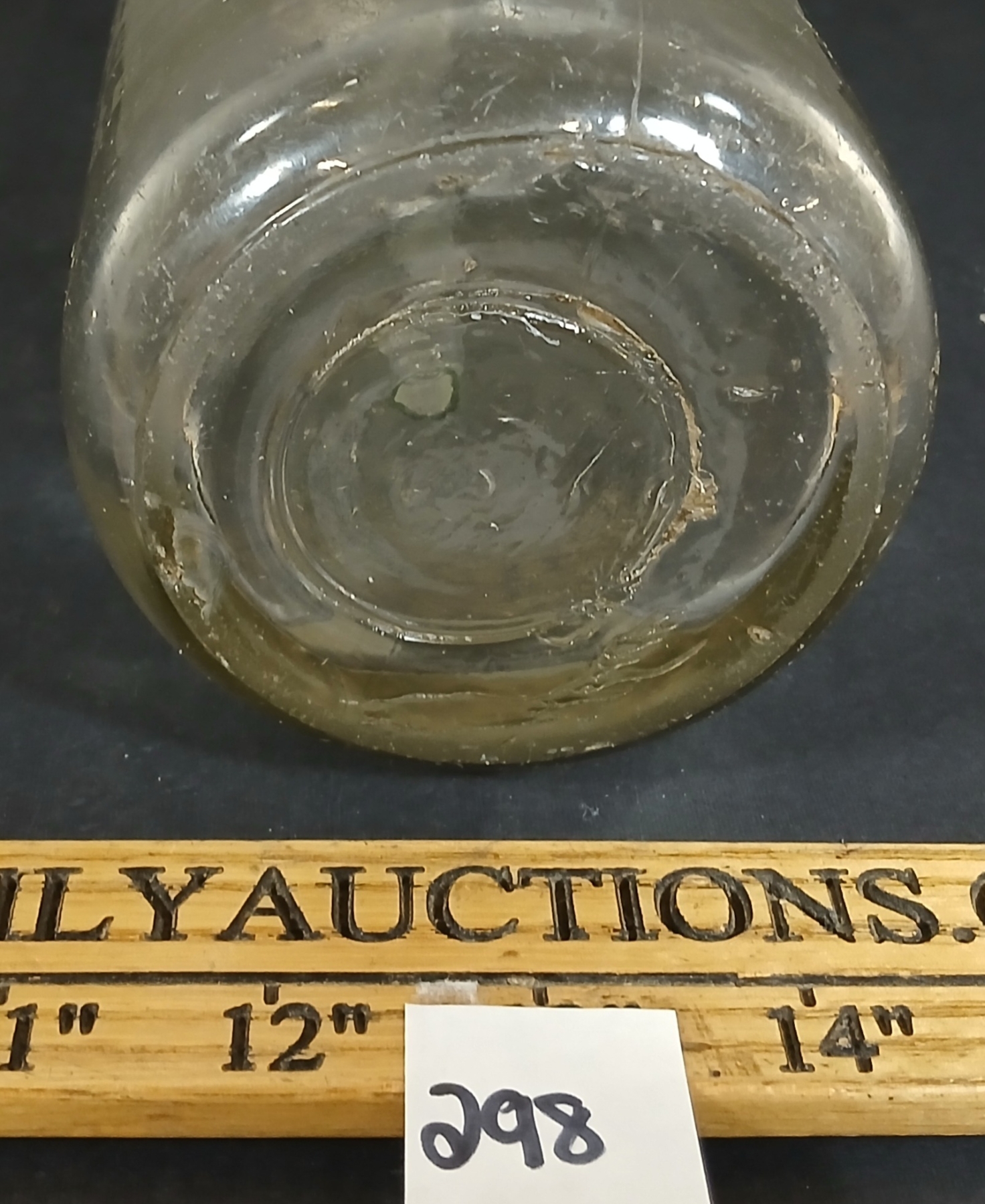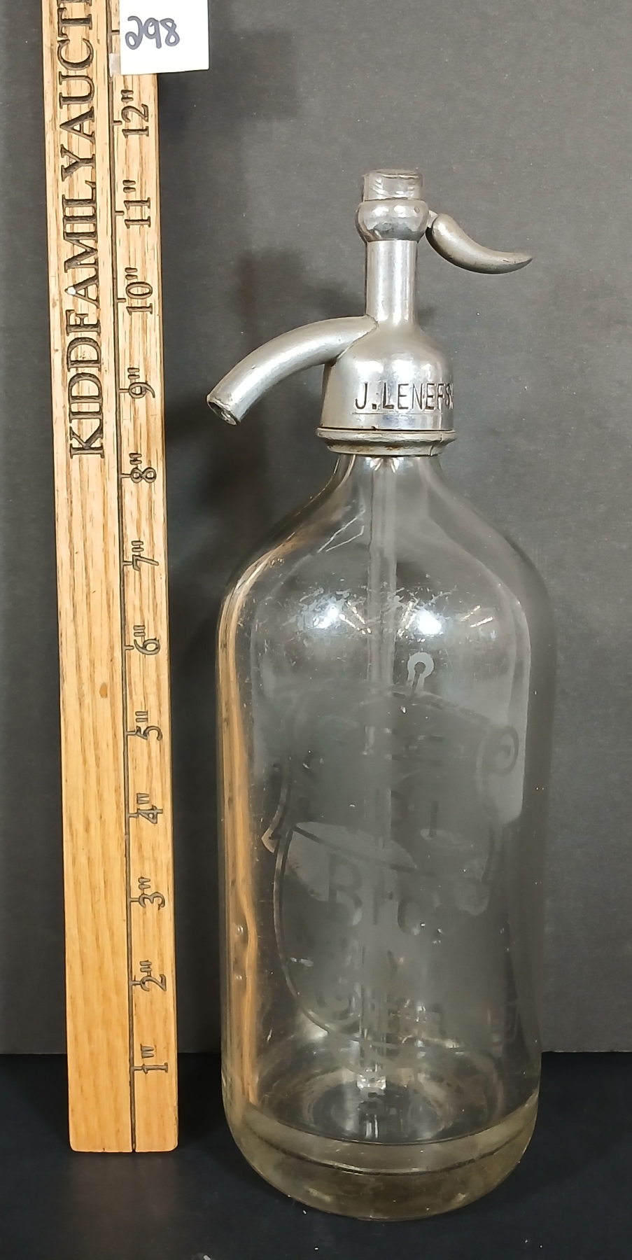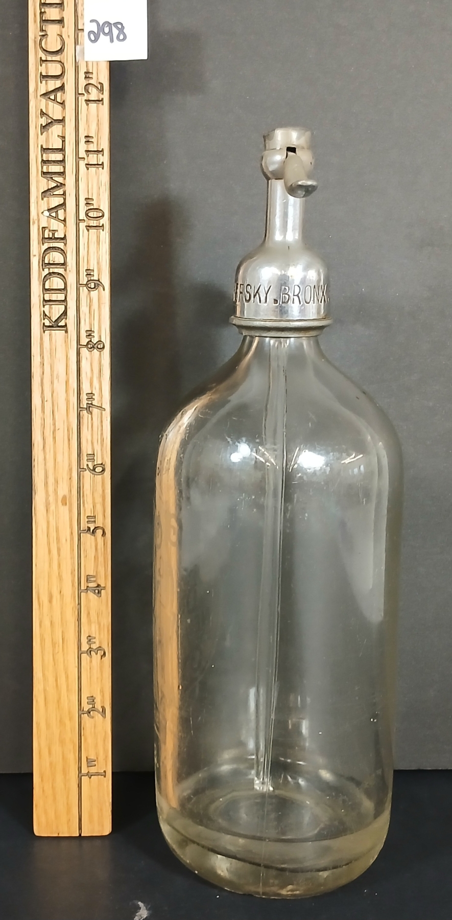 NOTE: MARKED MADE IN NEW YORK - SPIGOT MARKED J. LENEFSKY. BRONX. 50 - W/ SMALL QTY OF CONTENTS - CHIPPED BOTTOM