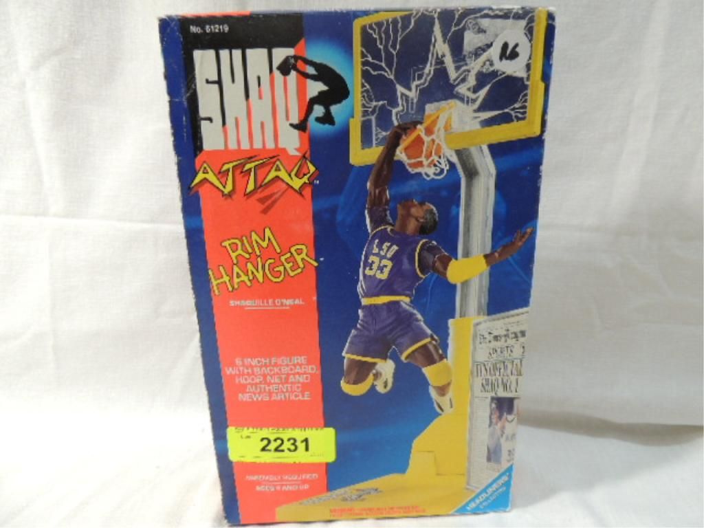 SHAQUILLE ONEAL 6" FIGURE WITH BACKBOARD, HOOP, NET AND AUTHENTIC NEWS ARTICLE. AS SHOWN. SEE PHOTO FOR DETAILS.