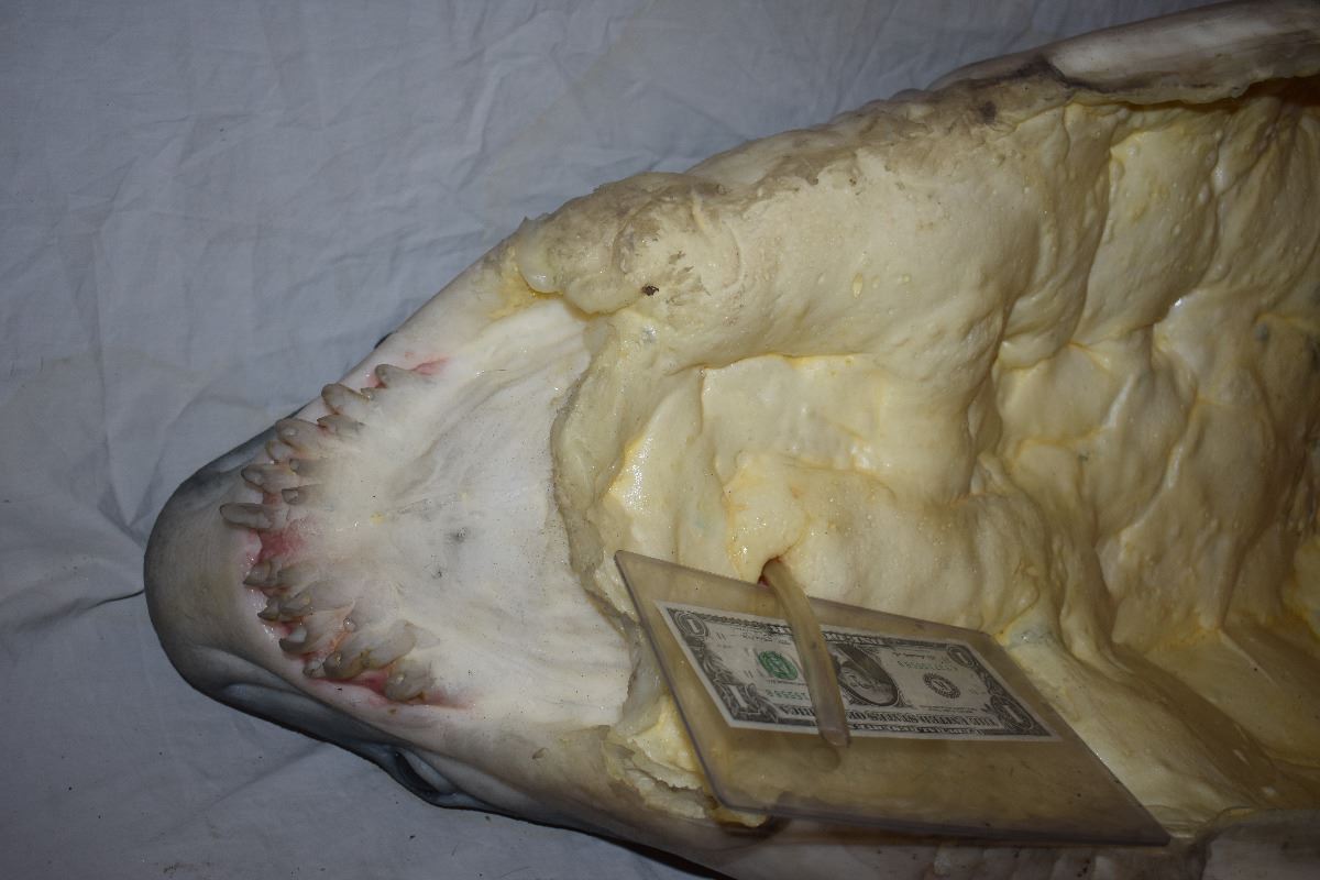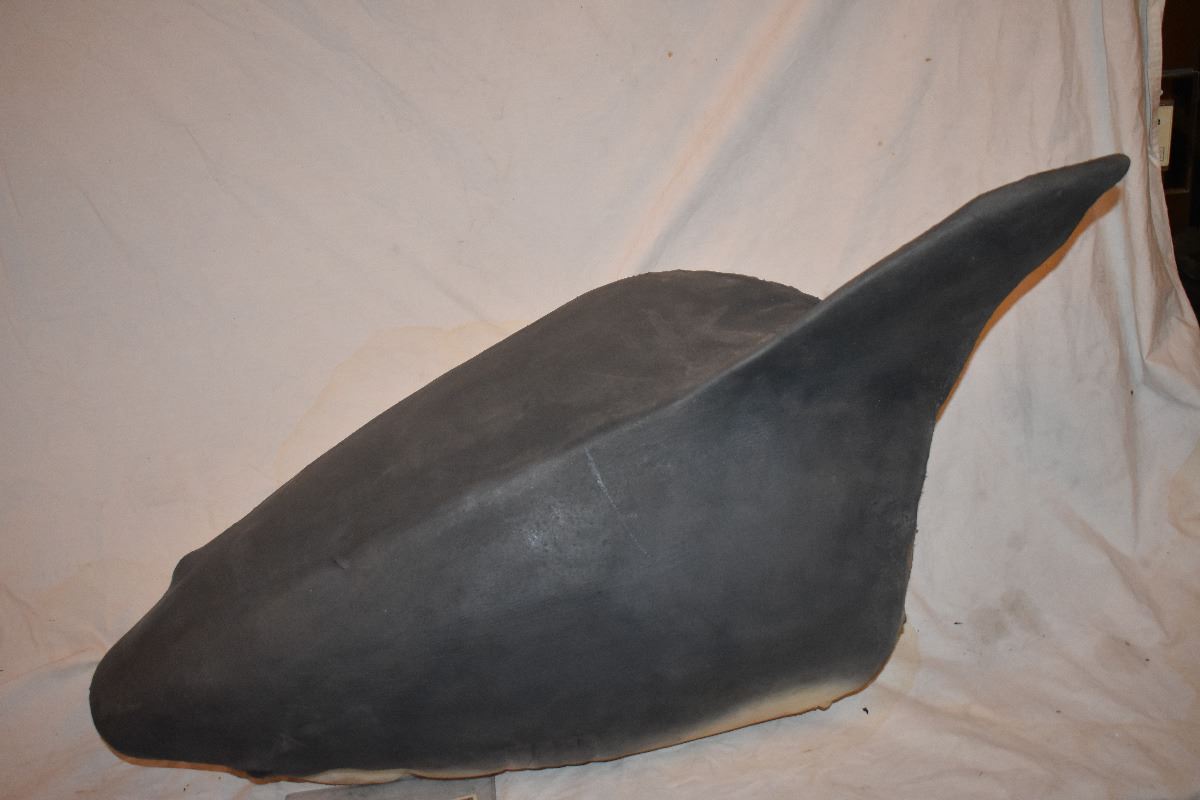 This is a Great White shark prop that was hauled through the water. It also has a blood rig to bleed through the stab wound in the head so can be SCREEN MATCHED. Heavy silicon on urothane foam. Excellent MAN CAVE piece if nothing else!