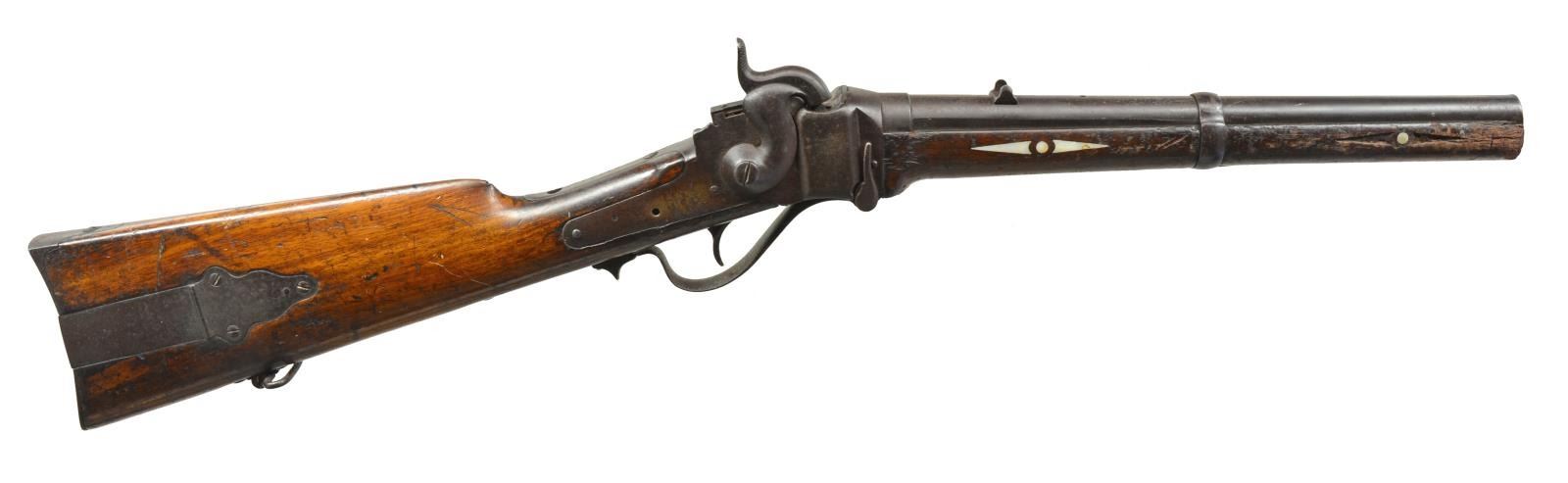 MILITARY PERCUSSION RIFLE. Cal. 52. S# C,35504. Featured in The Sharps Collector Vol. 24, No. 2 pg. 35 & 36. Bbl. shortened to 14 1/8" & retains base only for rear sight. Action is complete w/ Sharps pellet priming system integral w/ lockplate. Forearm is shortened to correspond w/ bbl. length & decorated w/ 5 sets of pearl ornamentation on sides & bottom consisting of sm. circle at center of 2 arrow style points. Straight grip walnut stock w/ rectangular lid iron patch box, steel rifle buttplate & sling swivel. The Sharps Collector article attributed the inlays as representing Civil War Union Corp badges. Identified badges include the arrow (17th Corp., 1st Div.), Heart (24th Corp, 1st Div.) & triangle (4th Corp., 3rd Div.). Heart inlay is missing. UNATTACHED ACCESSORIES: The Sharps Collector magazine as noted above; binder containing photos, diagrams & explanation of Indian marks by Wendell Grangaard, the Guns of History Inc. Sioux Falls, SD. Diagrams show Mr. Grangaard's interpretation of "Togia" markings that are partially distinguishable on the rifle. According to translation, these markings identify the rifle as belonging to "Bird Tail" who was in attendance at Little Big Horn, a Hunkpapa Lakota Sioux. Mr. Grangaard interprets the apparent Union Army Corp. badges to represent Indian symbols. CONDITION: metal has dark patina appearance showing light pitting. Wood has worn finish showing numerous scratches, dents & marks, many of which are identified by Mr. Grangaard as Indian markings. Hammer will not fully cock. Dark heavily pitted bore. (01-17980/DS). ANTIQUE. $5,000-7,500.