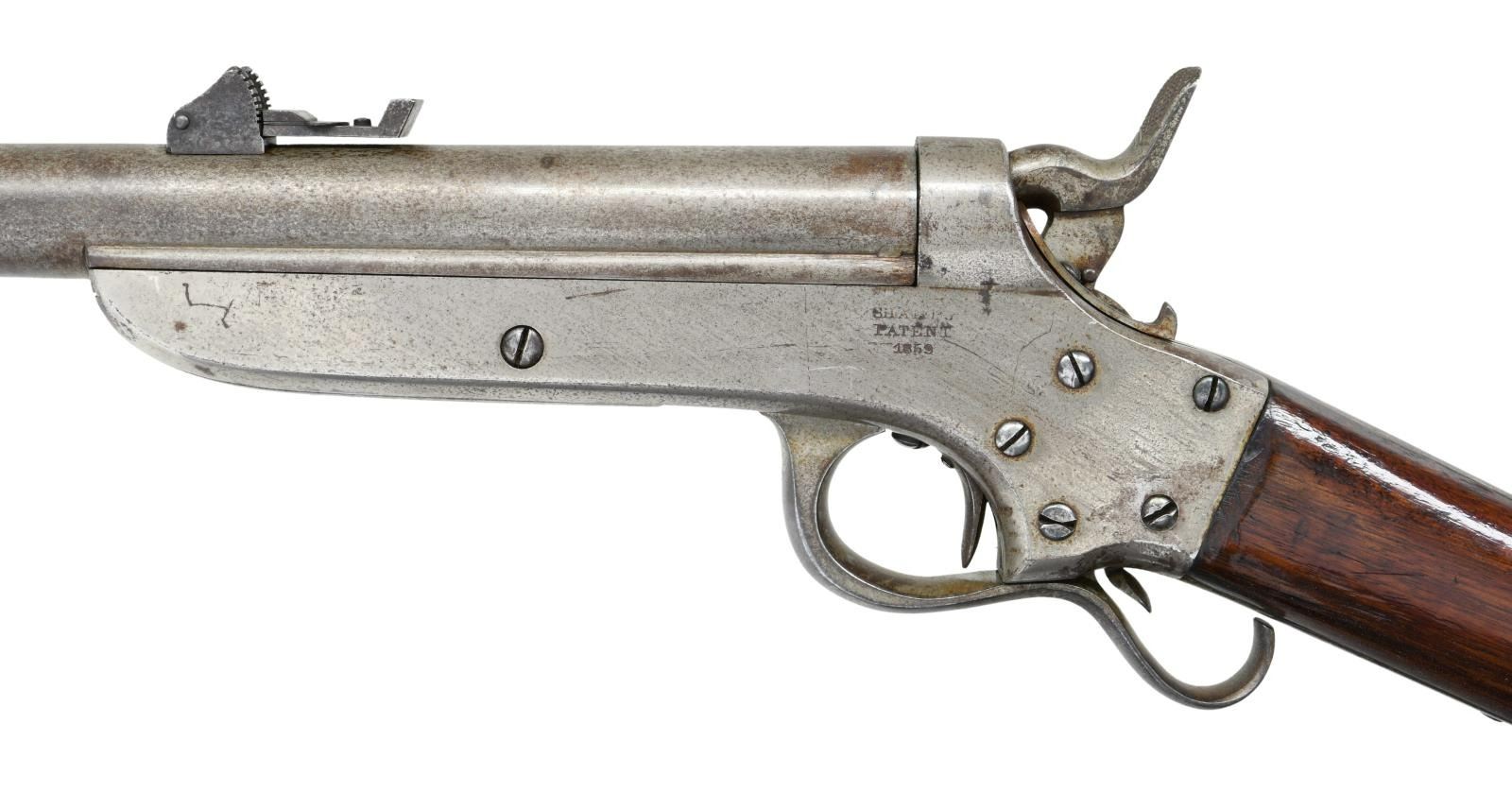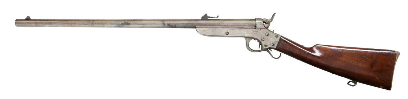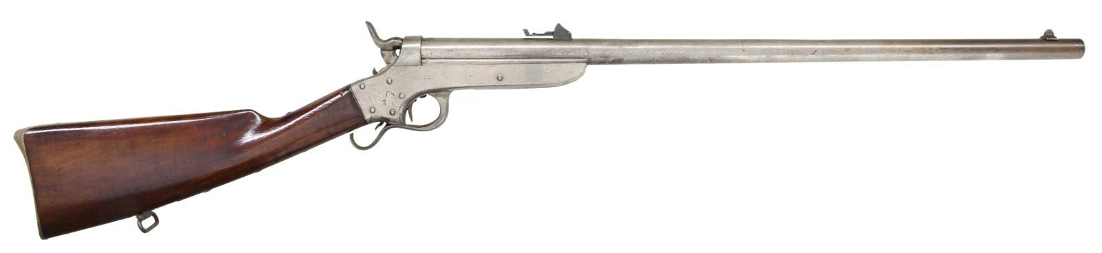 CAL. 52 RF. S# 1334. It is estimate that approx 500 were produced, about 200 of these were ordered by the US Army in 1865. Bbl. 24" with no provisions to attach the leather as found on the more common Navy variants and a dovetailed front sight and graduated rear sight. Floating firing pin with recoil shield. Unmarked walnut stock terminated with a brass buttplate. CONDITION: Overall good with metal surfaces presenting a light patina with some splotches of old oxidation. Stock has been refinished with an added varnish, some scattered light scuffs/handling marks, and a replacement screw in the lower tang. Dark bore with pitting and strong rifling. (01-23180/ZAL) ANTIQUE $1200-1800