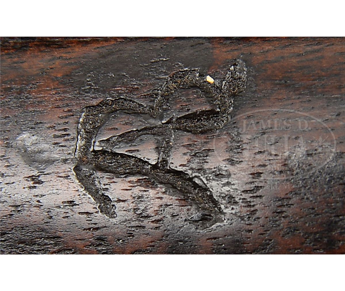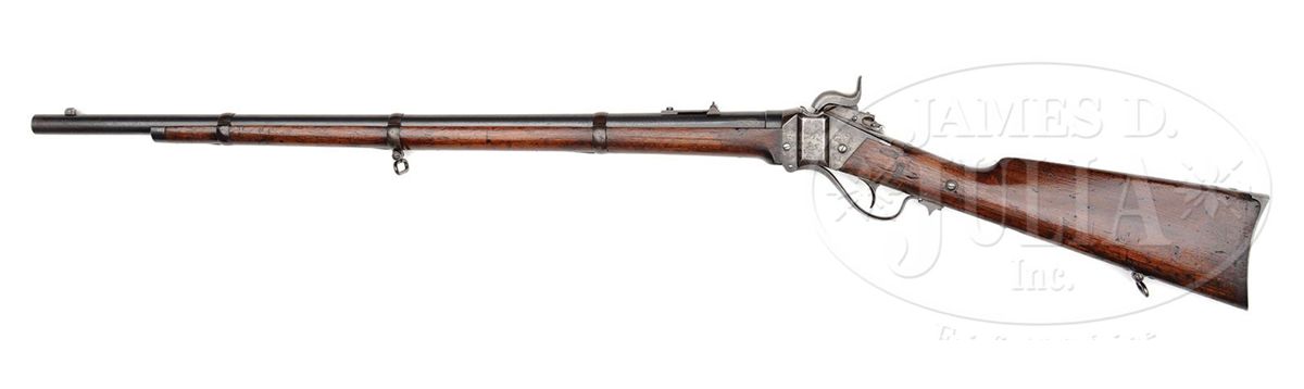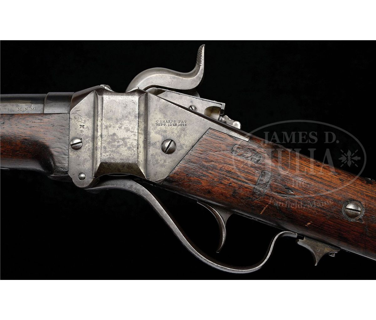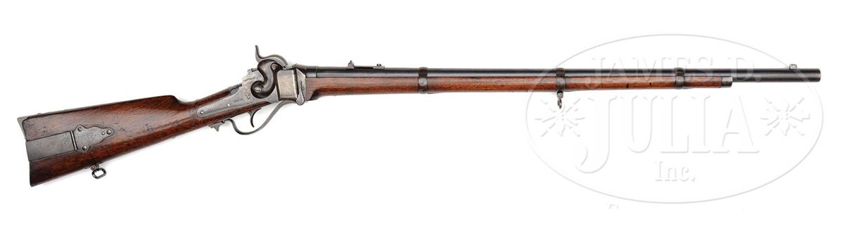 SN C34881. Cal. 52. You are bidding on a fine example of a popular Civil war Sharps 3-band rifle that retains much of its orig finish. The bbl on this gun has a nearly mint bore and retains most of its orig blue finish. This gun conforms to other Civil War military Sharps rifles with 30" rnd bbl, full forend stock with 3 spring retained bands, iron furniture including patchbox and bbl adapted for socket type bayonet. Bbl is marked "NEW MODEL 1863" and rifle has other bbl lock and frame markings typically found on this model. CONDITION: Bbl retains about 60% of its bright blue finish, though thinning and darkening overall. Bbl & rear sight markings are crisp and well defined. Frame and lock have traces of muted case color with balance being silver/gray with staining and pitting. Markings on lock and frame are well defined. Other metal parts are smooth with silver/gray patina. Sub-inspector marks are found on several parts. An inspection "M.N.M" is found on bbl and 3 initial inspector cartouches are found on stock. Stocks have been varnished and contain numerous small dings, dents and scratches. Inspector cartouches are well struck, but varnish obscures details as can be seen in photos. There is a pair of initials "AB" carved in monogram in top of butt stock comb, possibly denoting the soldier who carried this rifle. 4-49596 JS82